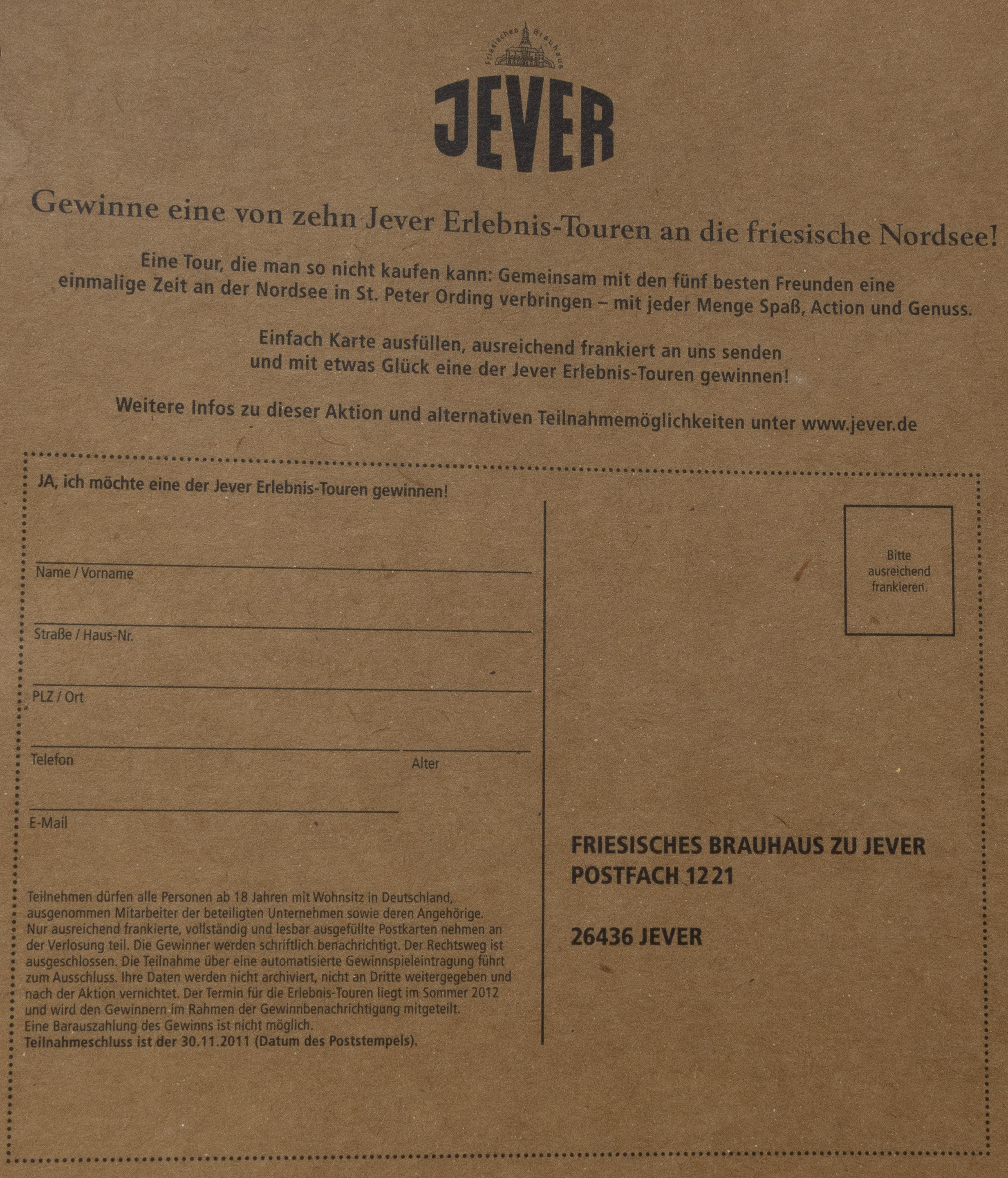Friesisches Brauhaus / JEVER / Gewinne eine von zehn Jever Erlebnis-Touren an die friesische Nordsee! / Eine Tour, die man so nicht kaufen kann: Gemeinsam mit den fünf besten Freunden eine einmalige Zeit an der Nordsee in St. Peter Ording verbringen - mit jeder Menge Spaß, Action und Genuss. / Einfach Karte ausfüllen, ausreichend frankiert an uns senden und mit etwas Glück eine der Jever Erlebnis-Touren gewinnen! / Weitere Infos zu dieser Aktion und alternativen Teilnahmemöglichkeiten unter www.jever.de / JA, ich möchte einer der Jever Erlebnis-Touren gewinnen! / Name/vorname / Straße/Haus-Nr. / PLZ/Oert / Telefon / Alter / E-Mail / Teilnehmen dürfen alle Personen ab 18 Jahren mit Wohnsitz in Deutschland, ausgenommen Mitarbeiter der beteiligten Unternehmen sowie deren Angehörige. Nur ausreichend frankierte, vollständig und lesbar ausgefüllte Postkarten nehmen an der Verlosung teil. Die Gewinner werden schriftlich benachrichtigt. Der Rechtsweg ist ausgeschlossen. Die Teilnahme über eine automatisierte Gewinnspieleintragung führt zum Ausschluss. Ihre Daten werden nicht archiviert, nicht an Dritte weitergegeben und nach der Aktion vernichtet. Der Termin für die Erlebnis-Touren liegt im Sommer 2012 und wird den Gewinnern im Rahmen der Gewinnbenachrichtigung mitgeteilt. Eine Barauszahlung des Gewinns ist nicht möglich. / Teilnahmeschluss ist der 30.11.2011 (Datum des Poststempels). / Bitte ausreichend frankieren! / FRIESISCHES BRAUHAUS ZU JEVER / POSTFACH 1221 / 26436 JEVER