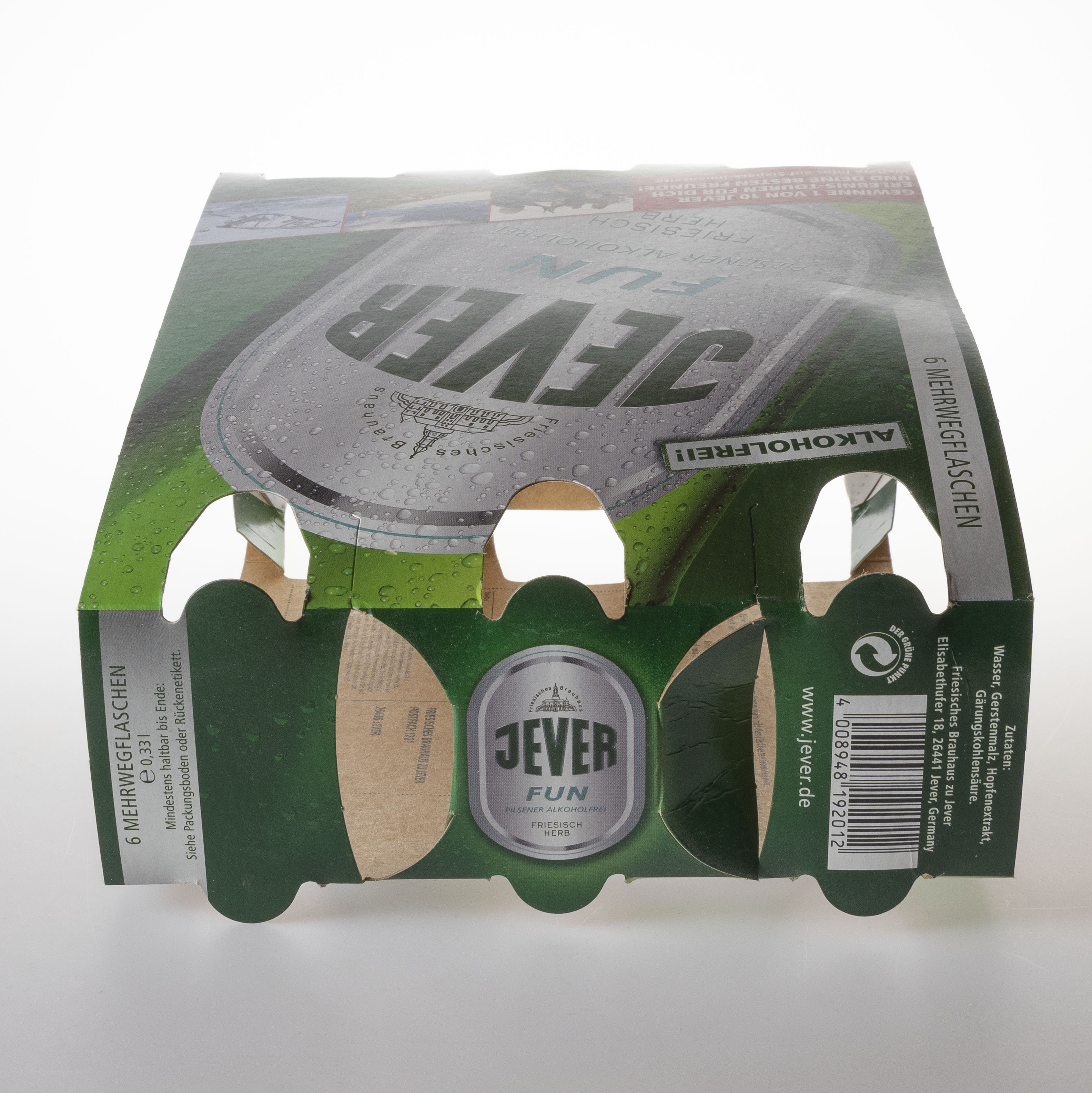 6 MEHRWEGFLASCHEN / e 0,33l / Mindestens haltbar bis Ende: Siehe Packungsboden oder Rückenetikett / Friesisches Brauhaus / JEVER / FUN / PILSENER ALKOHOLFREI / FRIESISCH HERB / www.jever.de / DER GRÜNE PUNKT / 4 008948 192012 / Zutaten: Wasser, Gerstenmalz, Hopfenextrakt, Gärungskohlensäure. / Friesisches Brauhaus zu Jever Elisabethufer 18 26441 Jever, Germany