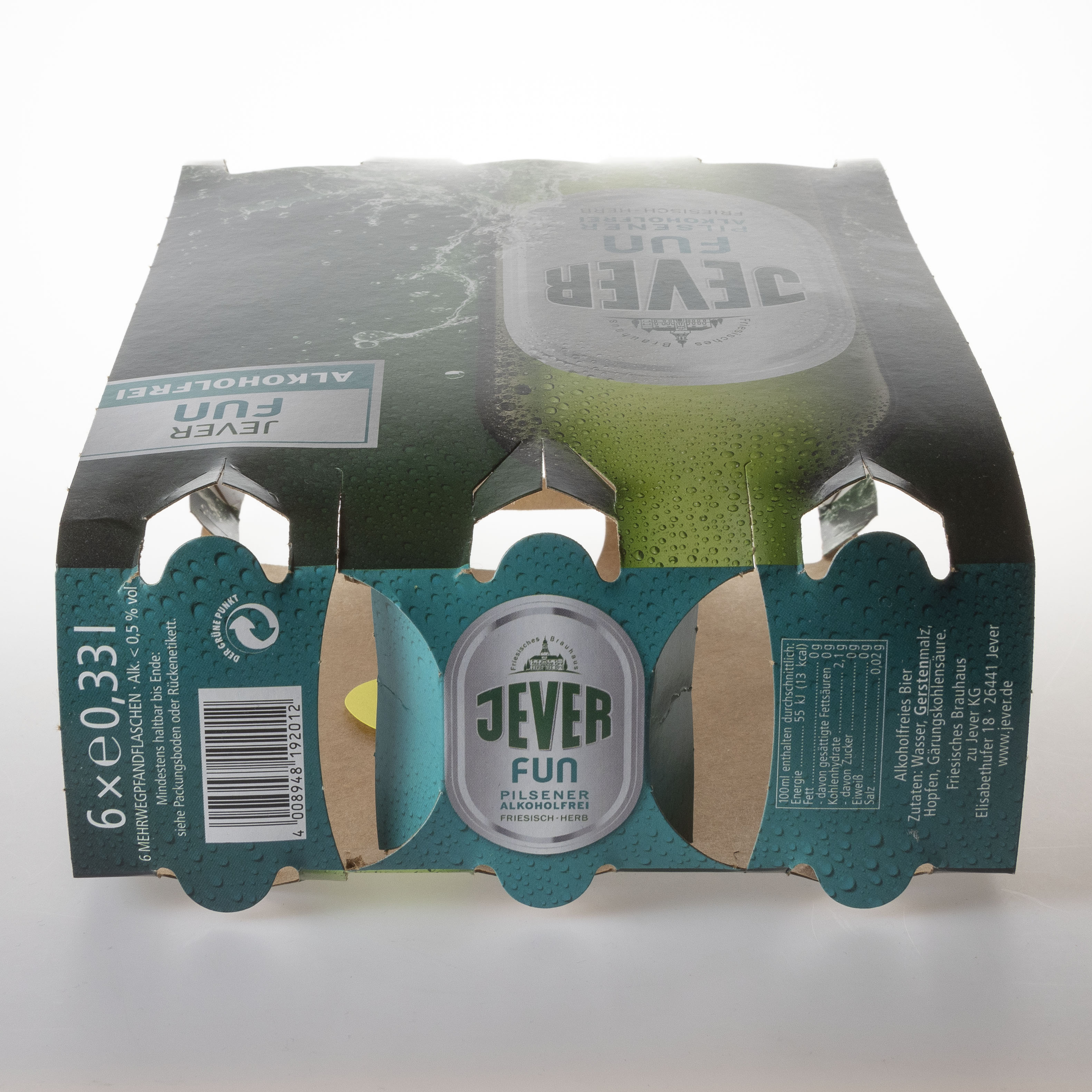 6x e 0,33l / 6 MEHRWEGPFANDFLASCHEN Alk. < 0,5% vol / Mindestens haltbar bis Ende: siehe Packungsboden oder Rückenetikett. / 4 008948 192012 / DER GRÜNE PUNKT / Friesisches Brauhaus / JEVER / FUN / PILSENER ALKOHOLFREI / FRIESISCH-HERB / 100ml enthalten durchschnittlich: Energie 55kJ (13 kcal) Fett 0g - davon gesättigte Fettsäuren 0g Kohlenhydrate 2,1g - davon Zucker 0g Eiweiß 0g Salz 0,02g / Alkoholfreies Bier - Zutaten: Wasser, Gerstenmalz, Hopfen, Gärungskohlensäure. / Friesisches Brauhaus zu Jever KG Elisabethufer 18 26441 Jever / www.jever.de