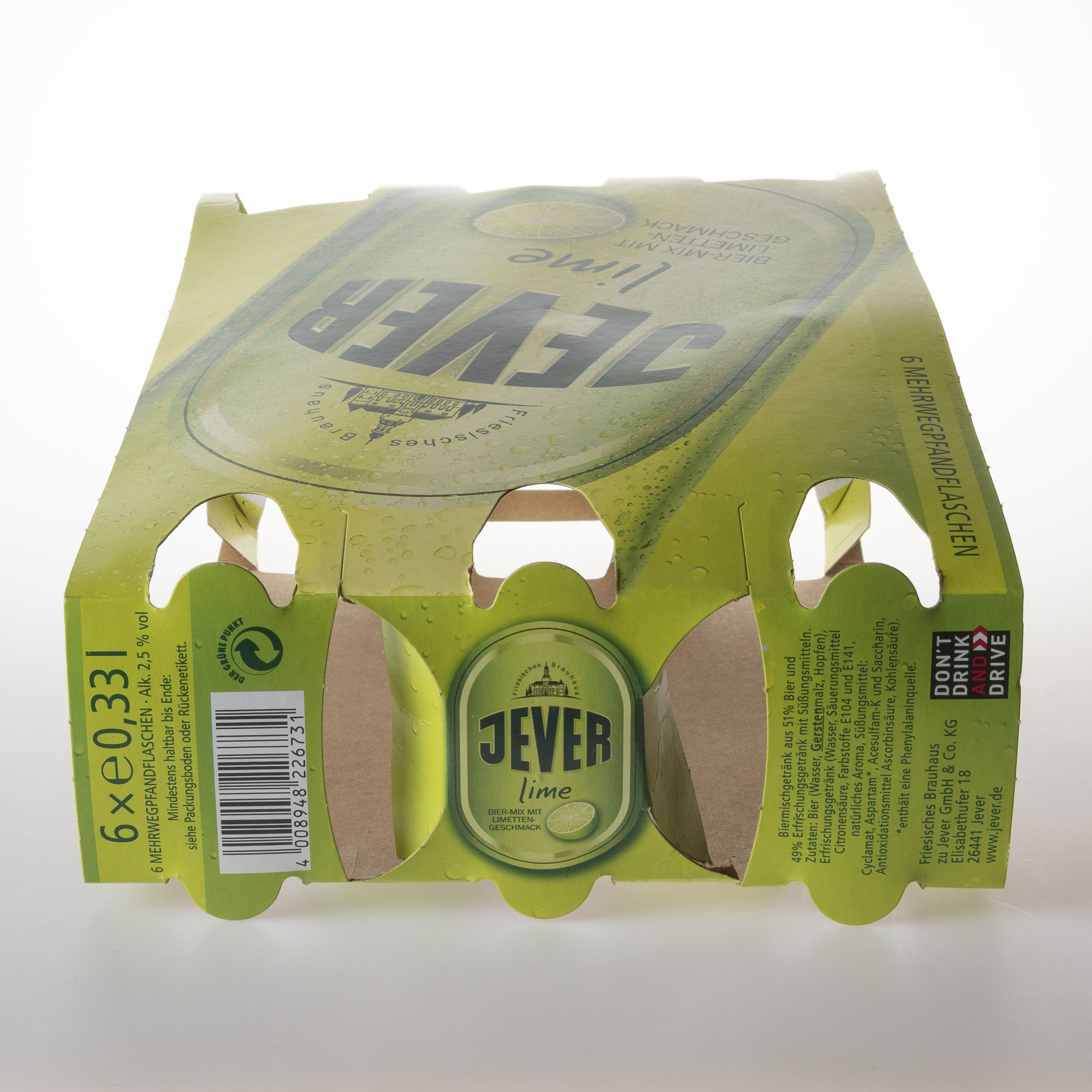 6 x e 0,33l / 6 MEHRWEGPFANDFLASCHEN Alk. 2,5% vol / Mindestens haltbar bis Ende: siehe Packungsboden oder Rückenetikett / 4 008948 226731 / DER GRÜNE PUNKT / Friesisches Brauhaus / JEVER / lime / BIER-MIX MIT LIMETTEN-GESCHMACK / Biermischgetränk aus 51% Bier und 49% Erfrischungsgetränk mit Süßungsmitteln. Zutaten: Bier (Wasser, Gerstenmalz, Hopfen), Erfrischungsgetränk (Wasser, Säuerungsmittel: Cyclamat, Aspartam, Acesulfam-K und Saccharin, Antioxidationsmittel Ascorbinsäure, Kohlensäure). enthält eine Phenylalaninquelle. / Friesisches Brauhaus zu Jever GmbH & Co. KG Elisabethufer 18 26441 Jever www.jever.de / DON’T DRINK AND DRIVE