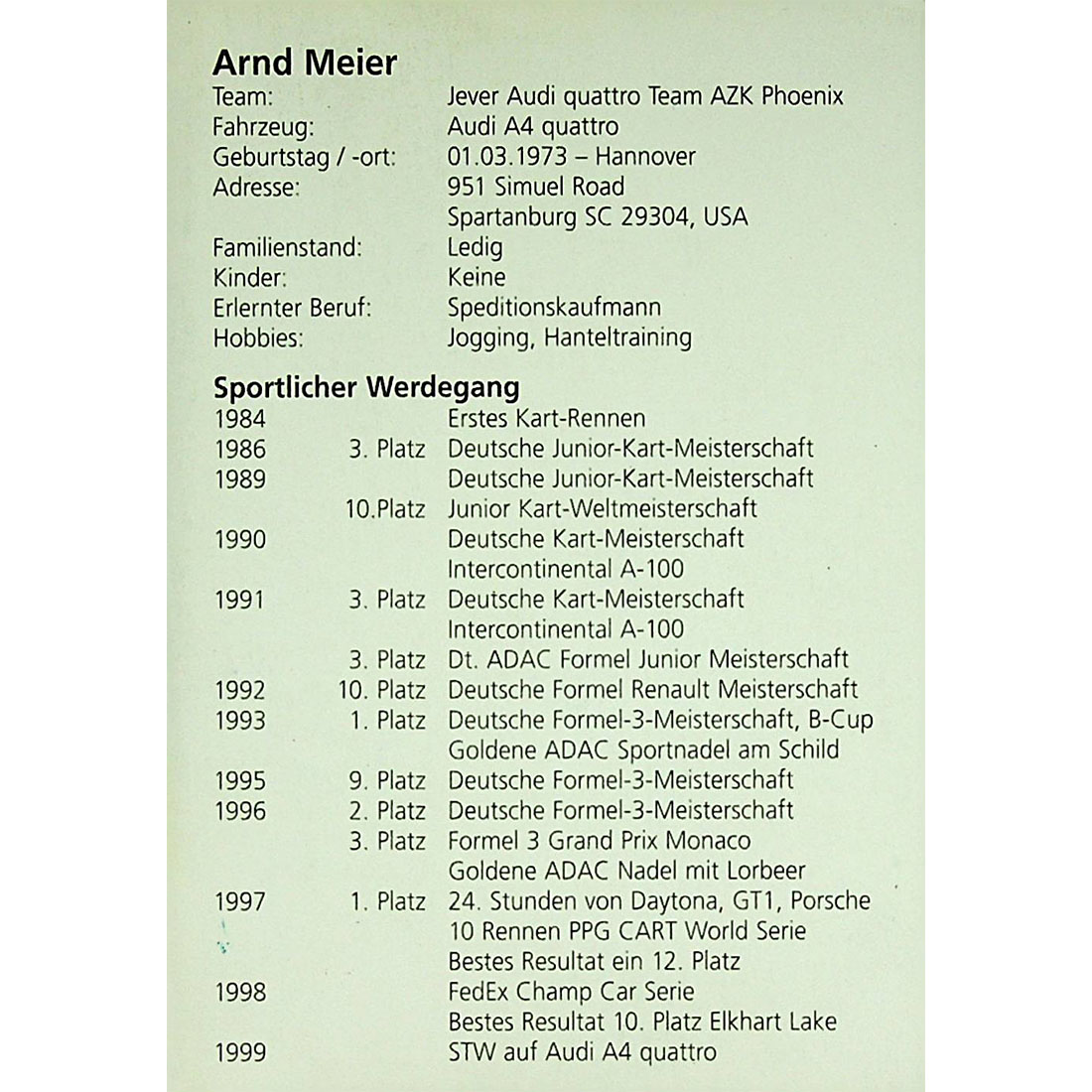 Attribut Wert Alter (min.) Alter (max.) Identifikation (Jever-Fan) ID I003117 / S0597 / Typ Autogrammkarten Attribute (Allgemein) Event Deutsche Super-Tourenwagen-Meisterschaft Form Rechteckig Logo Dachmarke 1 Maße HxBxT (cm) 10,0x15,0x Material Papier/Pappe Sorte (Dachmarke) Attribute (Zeitstempel) Eigene 19990000 1999 1999