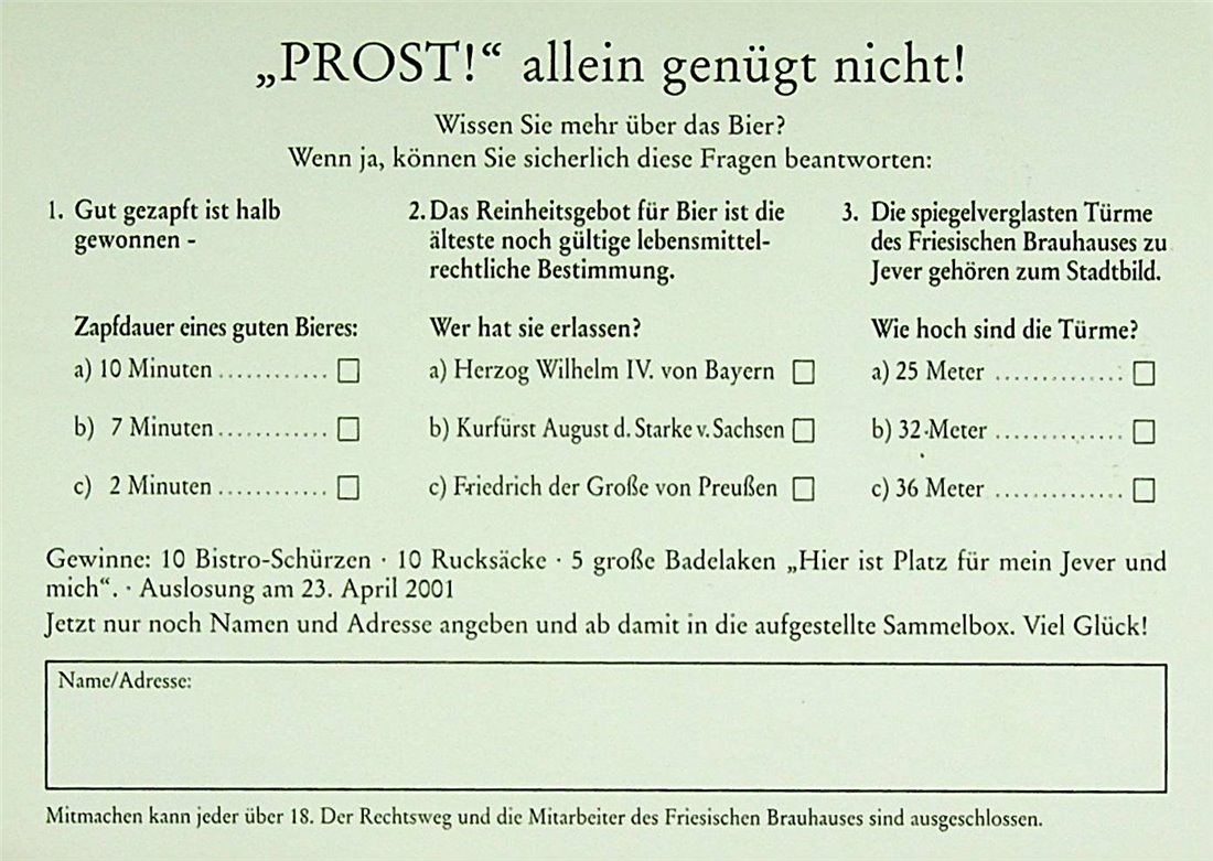 “PROST!” allein genügt nicht! / Wissen Sie mehr über das Bier? Wenn ja, können Sie sicherlich diese Fragen beantworten: / 1. Gut gezapft ist halb gewonnen - Zapfdauer eines guten Bieres: a) 10 Minuten b) 7 Minuten c) max. 2 Minuten / 2. Das Reinheitsgebot für Bier ist die älteste noch gültige lebensmittelrechtliche Bestimmung. Wer hat sie erlassen? a) Herzog Wilhelm IV. von Bayern b) Kurfürst August d. Starke v. Sachsen c) Friedrich der Große von Preußen / 3. Die spiegelverglasten Türme des Friesischen Brauhauses zu Jever zum Stadtbild. Wie hoch sind die Türme? a) 25 Meter b) 32 Meter c) 36 Meter / Gewinne: 10 Bistro-Schürzen - 10 Rucksäcke - 5 große Badelaken - Auslosung am 23. April 2001 / Jetzt nur noch Namen und Adresse angeben und ab damit in die aufgestellte Sammelbox. Viel Glück! / Name/Adresse: / Mitmachen kann jeder über 19. Leider sind der Rechtsweg und die Mitarbeiter des Friesischen Brauhauses ausgeschlossen.