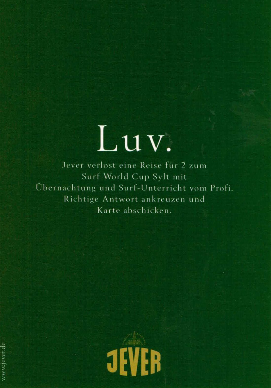 Luv. / Jever verlost eine Reise für 2 zum Surf World Cup Sylt mit Übernachtung und Surf-Unterricht vom Profi. Richtige Antwort ankreuzen und Karte abschicken. / www.jever.de / Friesisches Brauhaus / JEVER