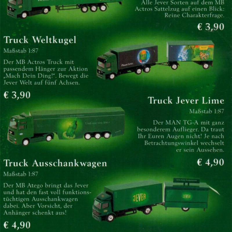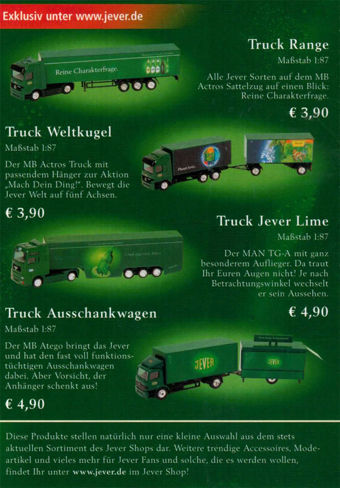 Exklusiv unter www.jever.de / Truck Range Maßstab 1:87 Alle jever Sorten auf dem MB Actros Sattelzug auf einen Blick: Reine Charakterfrage. / € 3,90 / Truck Weltkugel Maßstab 1:87 Der MB Actros Truck mit passendem Hänger zur Aktion “Mach Dein Ding!”. Bewegt die Jever Welt auf fünf Achsen. / € 3,90 / Truck Jever Lime Maßstab 1:87 / Der MAN TG-A mit ganz besonderem Auflieger. Da traut Ihr Euren Augen nicht! Je nach Betrachtungswinkel wechselt er sein Aussehen. / € 4,90 / Truck Ausschankwagen Maßstab 1:87 Der MB Atego bringt das Jever und hat den fast voll funktionstüchtigen Ausschankwagen dabei. Aber Vorsicht, der Anhänger schenkt aus! / € 4,90 / Diese Produkte stellen natürlich nur eine kleine Auswahl aus dem stets aktuellen Sortiment des Jever Shops dar. Weitere trendige Accessoires, Modeartikel und vieles mehr für Jever Fans und solche, die es werden wollen, findet Ihr unter www.jever.de im Jever Shop!
