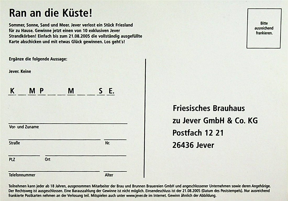 Ran an die Küste! / Sommer, Sonne, Sand und Meer. Jever verlost ein Stück Friesland für zu Hause. Gewinne jetzt einen von 10 exklusiven Jever Strandkörben! Einfach bis zum 21.08.2005 die vollständig ausgefüllte Karte abschicken und mit etwas Glück gewinnen, Los geht’s! / Ergänze die folgende Aussage: Jever. Keine K_MPMSE. / Vor- und Zuname / Straße / Nr. / PLZ / Ort / Teilnehmen kann jeder über 18 Jahren, ausgenommen Mitarbeiter der Brau und Brunnen Brauereien GmbH und angeschlossener Unternehmen sowie deren Angehörige. Der Rechtsweg ist ausgeschlossen. Eine Barauszahlung der Gewinne ist nicht möglich. Einsendeschluss ist der 21.08.2005 (Datum des Poststempels). Nur ausreichend frankierte Postkarten nehmen an der Verlosung teil. Mitspielen auch unter www.jever.de im Internet. / Gewinn ähnlich der Abbildung. / Bitte ausreichend frankieren. / Friesisches Brauhaus zu Jever GmbH & Co. KG Postfach 1221 26436 Jever