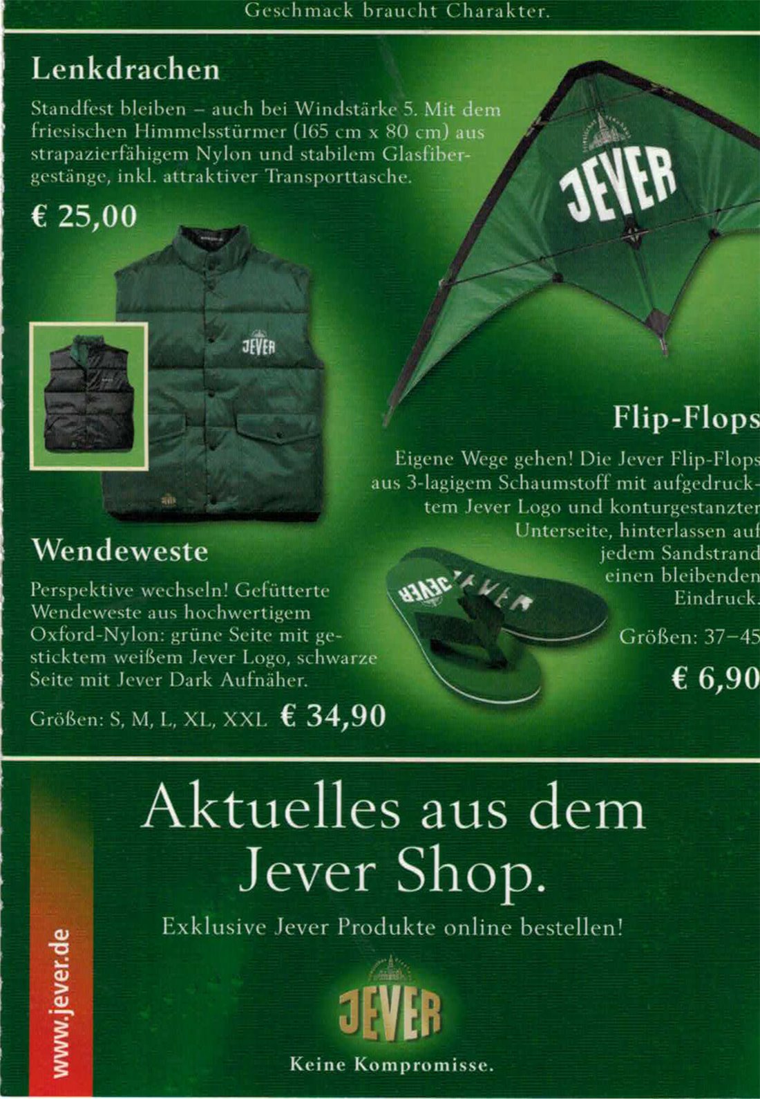 Geschmack braucht Charakter. / Lenkdrachen Standfest bleiben - auch bei Windstärke 5. Mit dem friesischen Himmelsstürmer (165 cm x 80 cm) aus strapazierfähigem Nylon und stabilem Glasfibergestänge, inkl. attraktiver Transporttasche. / € 25,00 / Flip-Flops Eigene Wege gehen! Die Jever Flip-Flops aus 3-lagigem Schaumstoff mit aufgedrucktem Jever Logo und konturgestanzter Unterseite, hinterlassen auf jedem Sandstrand einen bleibenden Eindruck! Größen: 37-45 / € 6,90 / Wendeweste Perspektive wechseln! Gefütterte Wendeweset aus hochwertigem Oxford-Nylon: grüne Seite mit gesticktem weißem Jever Logo, schwarze Seite mit Jevere Dark Aufnäher. Größen: S, M, L, XL, XXL / € 34,90 / Aktuelles aus dem Jever Shop. / Exklusive Jever Produkte online bestellen! / www.jever.de / Friesisches Brauhaus / JEVER / Keine Kompromisse.
