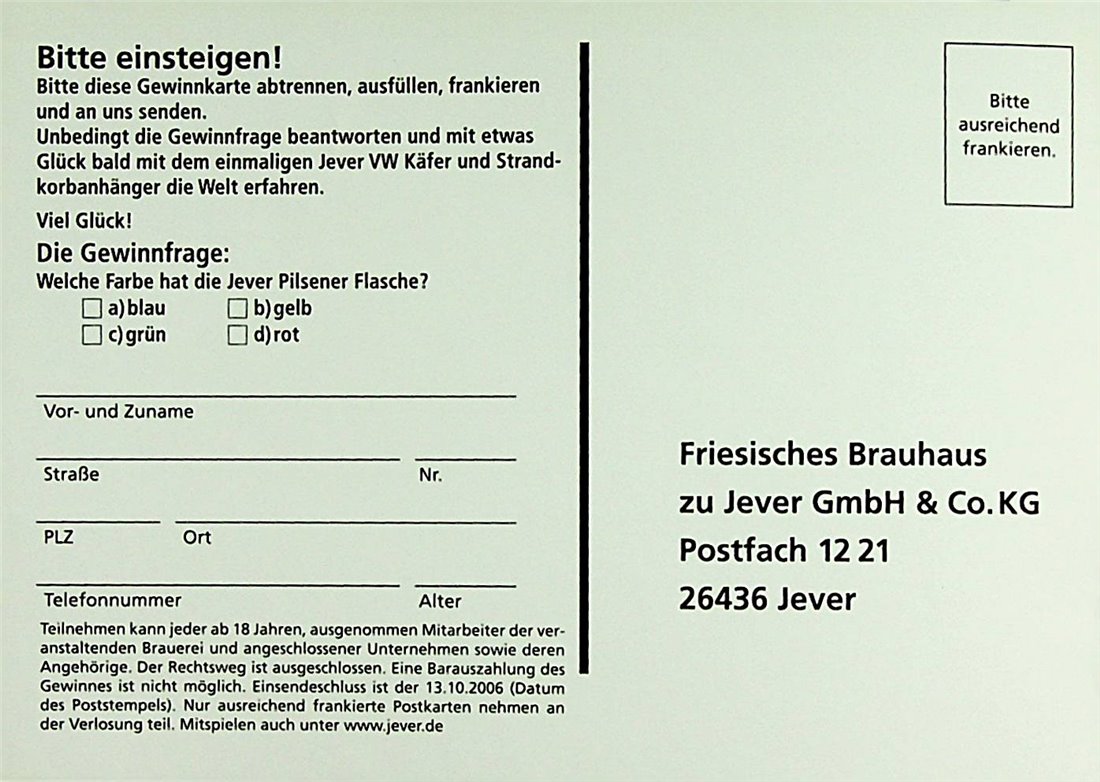 Bitte einsteigen! / Bitte diese Gewinnkarte abtrennen, ausfüllen, frankieren und an uns senden. / Unbedingt die Gewinnfrage beantworten und mit etwas Glück bald mit dem einmaligen Jever VW Käfer und Strandkorbanhänger die Welt erfahren. Viel Glück! / Die Gewinnfrage: Welche Farbe hat die Jever Pilsener Flasche? / a) blau / b) gelb / c) grün / d) rot / Vor- und Zuname / Straße / Nr. / PLZ / Ort / Telefonnummer / Alter / Teilnehmen kann jeder ab 18 Jahren, ausgenommen Mitarbeiter der veranstaltenden Brauerei und angeschlossener Unternehmen sowie deren Angehörige. Der Rechtsweg ist ausgeschlossen. Eine Barauszahlung des Gewinns ist nicht möglich. Einsendeschluss ist der 13.10.2006 (Datum des Poststempels). Nur ausreichend frankierte Postkarten nehmen an der Verlosung teil. Mitspielen auch unter www.jever.de / Bitte ausreichend frankieren. / Friesisches Brauhaus zu Jever GmbH & Co. KG Postfach 1221 26436 Jever