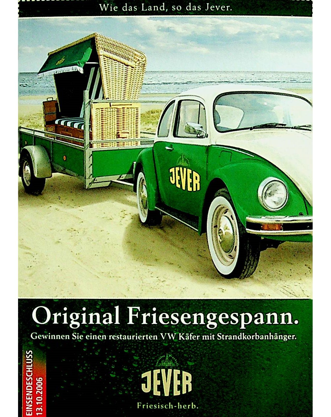 Wie das Land, so das Jever. / Original Friesengespann. / Gewinnen Sie einen restaurierten VW Käfer mit Strandkorbanhänger. / EINSENDESCHLUSS 13.10.2006 / Friesisches Brauhaus / JEVER / Friesisch-herb.