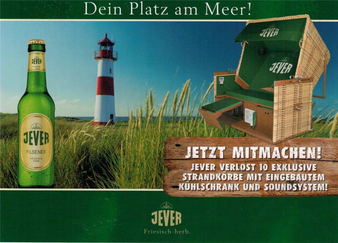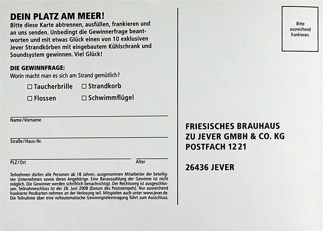 DEIN PLATZ AM MEER! / Bitte diese Karte abtrennen, ausfüllen, frankieren und an uns senden. / Unbedingt die Gewinnerfrage beantworten und mit etwas Glück einen von 10 exklusiven Jever Strandkörben mit eingebautem Kühlschrank und Soundsystem gewinnen. Viel Glück! / DIE GEWINNFRAGE: Worin macht man es sich am Strand gemütlich? / Taucherbrille / Strandkorb / Flossen / Schwimmflügel / Name/Vorname / Straße/Haus-Nr. / PLZ/Ort / Alter / Teilnehmen dürfen alle Personen ab 18 Jahren, ausgenommen Mitarbeiter der beteiligten Unternehmen sowie deren Angehörige. Der Rechtsweg ist ausgeschlossen. Teilnahmeschluss ist der 28. Juni 2008 (Datum des Poststempels). Nur ausreichend frankierte Postkarten nehmen an der Verlosung teil. Mitspielen auch unter www.jever.de Die Teilnahme über eine vollautomatische Gewinnspieleintragung führt zum Ausschluss. / Bitte ausreichend frankieren / FRIESISCHES BRAUHAUS ZU JEVER GMBH & CO. KG POSTFACH 1221 26436 JEVER