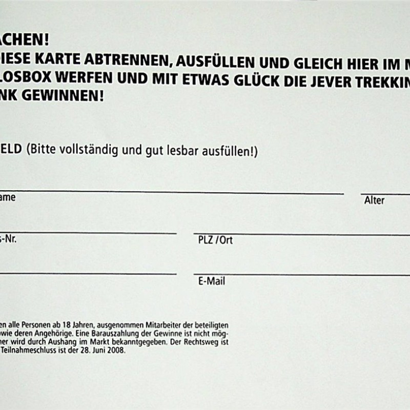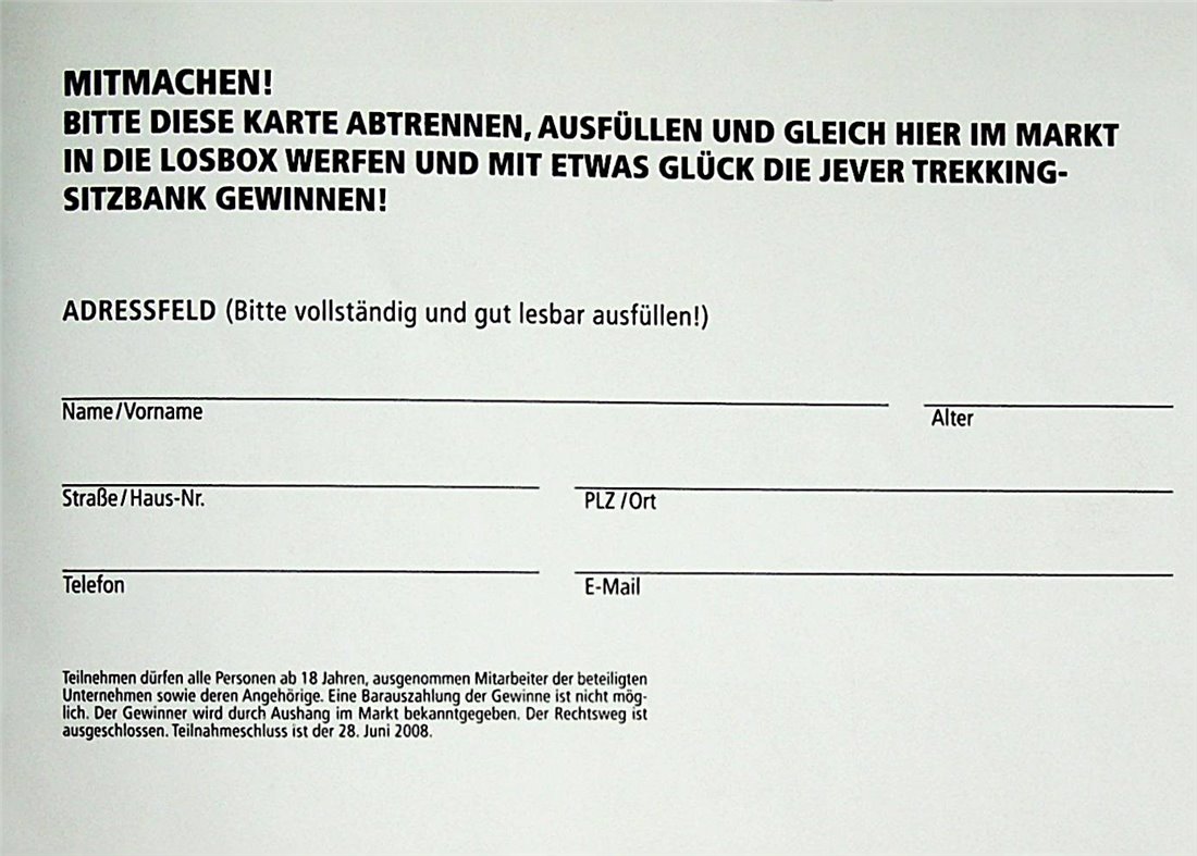 MITMACHEN! / BITTE DIESE KARTE ABTRENNEN, AUSFÜLLEN UND GLEICH HIER IM MARKT IN DIE LOSBOX WERFEN UND MIT ETWAS GLÜCK DIE JEVER TREKKING-SITZBANK GEWINNEN! / ADRESSFELD (Bitte vollständig und gut lesbar ausfüllen!) / Name/Vorname / Straße/Haus-Nr. / PLZ/Ort / Telefon / E-Mail / Teilnehmen dürfen alle Personen ab 18 Jahren, ausgenommen Mitarbeiter der beteiligten Unternehmen sowie deren Angehörige. Eine Barauszahlung der Gewinne ist nicht möglich. Der Gewinner wird durch Aushang im Markt bekanntgegeben. Der Rechtsweg ist ausgeschlossen. Teilnahmeschluss ist der 28. Juni 2008.