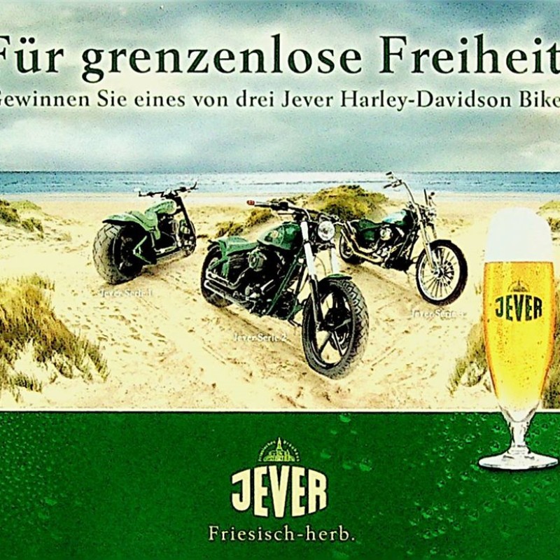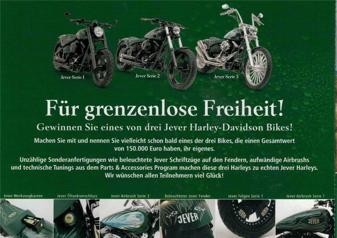 Jever Serie 1 / Jever Serie 2 / Jever Serie 3 / Für grenzenlose Freiheit! / Gewinnen Sie eines von drei Jever Harley-Davidson Bikes! / Machen Sie mit und nennen Sie vielleicht schon bald eines der drei Bikes, die einen gesamtwert von 150.000 Euro haben, ihr eigenes. / Unzählige Sonderanfertigungen wie beleuchtete Jever Schriftzüge auf den Fendern, aufwändige Airbrushs und technische Tunings aus dem Parts & Accessories Program machen diese drei Harleys zu echten Jever Harleys. Wir wünschen allen Teilnehmern viel Glück! / Jever Werkzeugkasten / Jever Öltankverschluss / Jever Airbrush Serie 3 / Beleuchteter Jever Fender / Jever Felgen Serie 1 / Jever Airbrush Serie 1