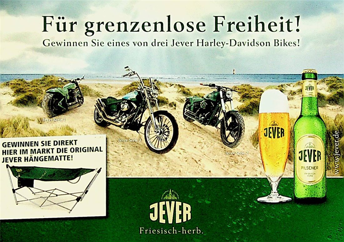 Für grenzenlose Freiheit! / Gewinnen Sie eines von drei Jever Harley-Davidson Bikes! / GEWINNEN SIE DIREKT HIER IM MARKT DIE ORIGINAL JEVER HÄNGEMATTE! / www.jever.de / Friesisches Brauhaus / JEVER / Friesisch-herb.