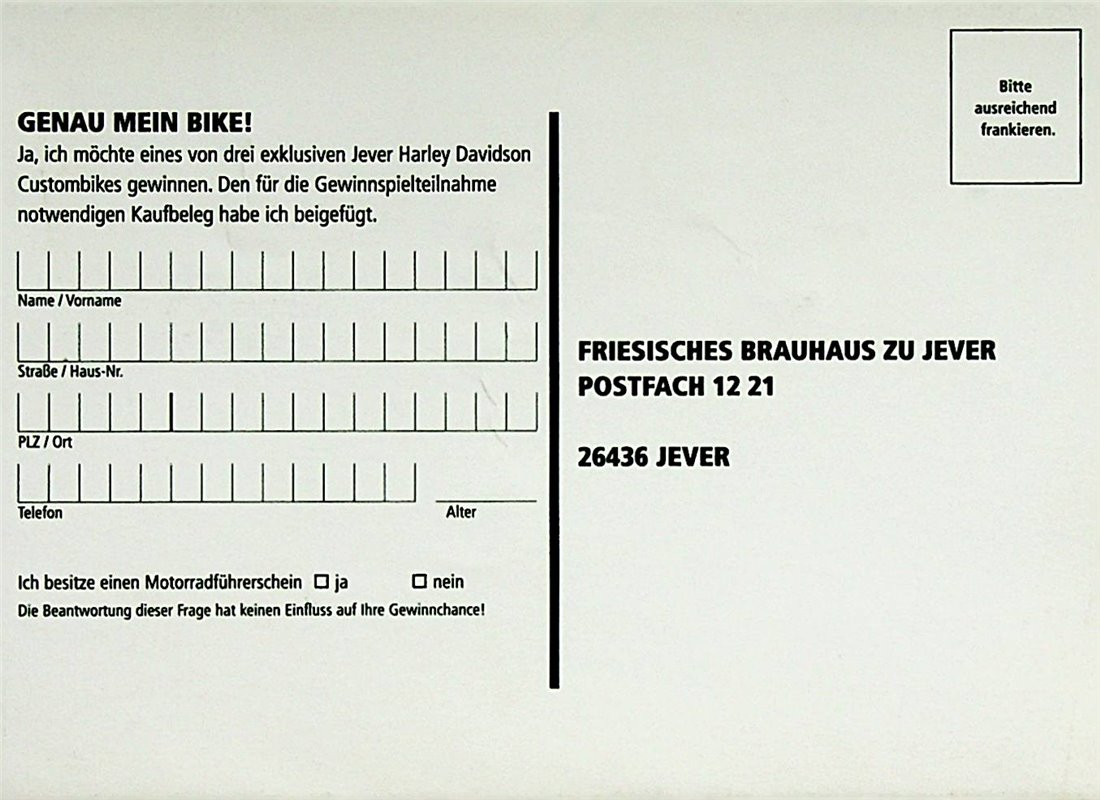 Genau mein Bike! / Ja, ich möchte eines von drei exklusiven Jever Harley Davidson Custombikes gewinnen. Den für die Gewinnspielteilnahme notwendigen Kaufbeleg habe ich beigefügt. / Name/Vorname / Straße/Haus-Nr. / PLZ/Ort / Telefon / Alter / Ich besitze einen Motorradführerschein ja nein / Die Beantwortung dieser Frage hat keinen Einfluss auf die Gewinnchance! / Bitte ausreichend frankieren. / FRIESISCHES BRAUHAUS ZU JEVER / POSTFACH 1221 26436 JEVER