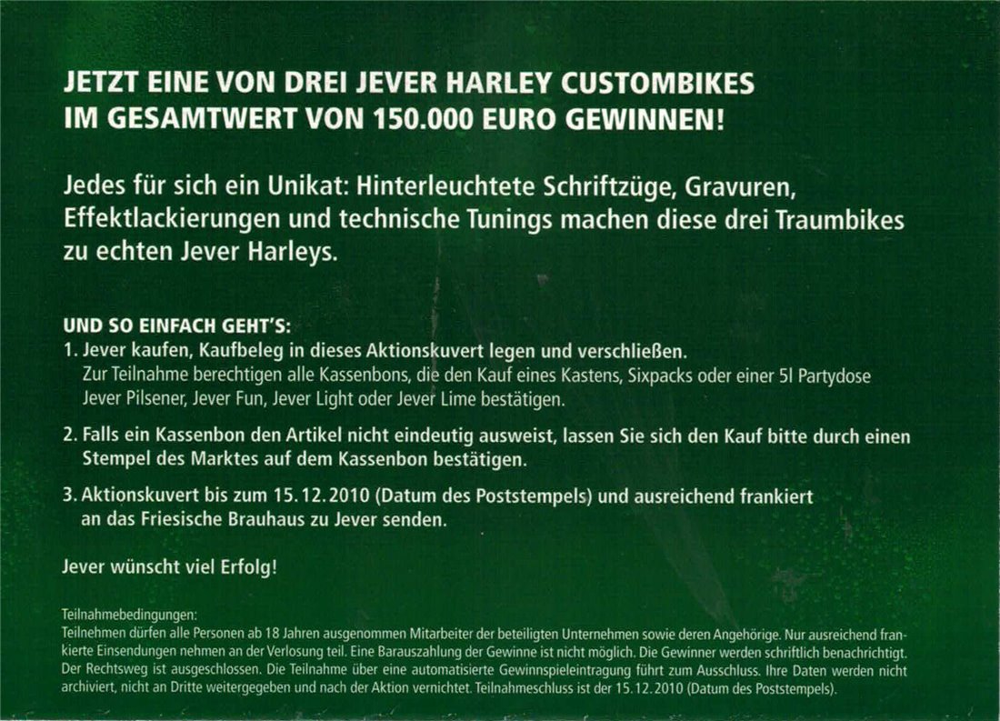 JETZT EINE VON DREI JEVER HARLEY CUSTOMBIKES IM GESAMTWERT VON 150.000 EURO GEWINNEN! / Jedes für sich ein Unikat: Hinterleuchtete Schriftzüge, Gravuren, Effektlackierungen und technische Tunings machen diese drei Traumbikes zu echten Jever Harleys. / UND SO EINFACH GEHT’S: / 1. Jever kaufen, Kaufbeleg in dieses Antwortkuvert legen und verschließen. Zur Teilnahme berechtigen alle Kassenbons, die den Kauf eines Kastens, Sixpacks oder einer 5l Partydose Jever Pilsener, Jever Fun, Jever Light oder Jever Lime bestätigen. / 2. Falls ein Kassenbon den Artikel nicht eindeutig ausweist, lassen Sie sich den Kauf bitte durch einen Stempel des Marktes auf dem Kassenbon bestätigen. / 3. Aktionskuvert bis zum 15.12.2010 (Datum des Poststempels) und ausreichend frankiert an das Friesische Brauahaus zu Jever senden. / Jever wünscht viel Erfolg! / Teilnahmebedingungen: Teilnehmen dürfen alle Personen ab 18 Jahren ausgenommen Mitarbeiter der beteiligten Unternehmen sowie deren Angehörige. Nur ausreichend frankierte Einsendungen nehmen an der Verlosung teil. Eine Barauszahlung der Gewinne ist nicht möglich. Die Gewinner werden schriftlich benachrichtigt. Der Rechtsweg ist ausgeschlossen. Die Teilnahme über eine automatisierte Gewinnspieleintragung führt zum Ausschluss. Ihre Daten werden nicht archiviert, nicht an Dritte weitergegeben und nach der Aktion vernichtet. Teilnahmeschluss ist der 15.12.2010 (Datum des Poststempels).
