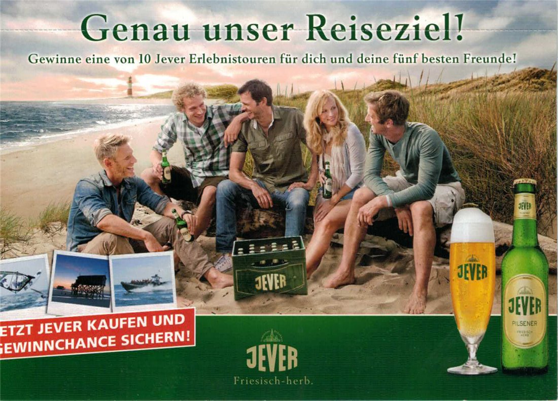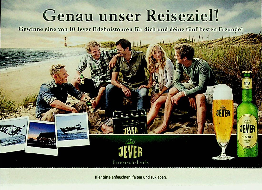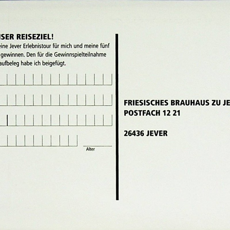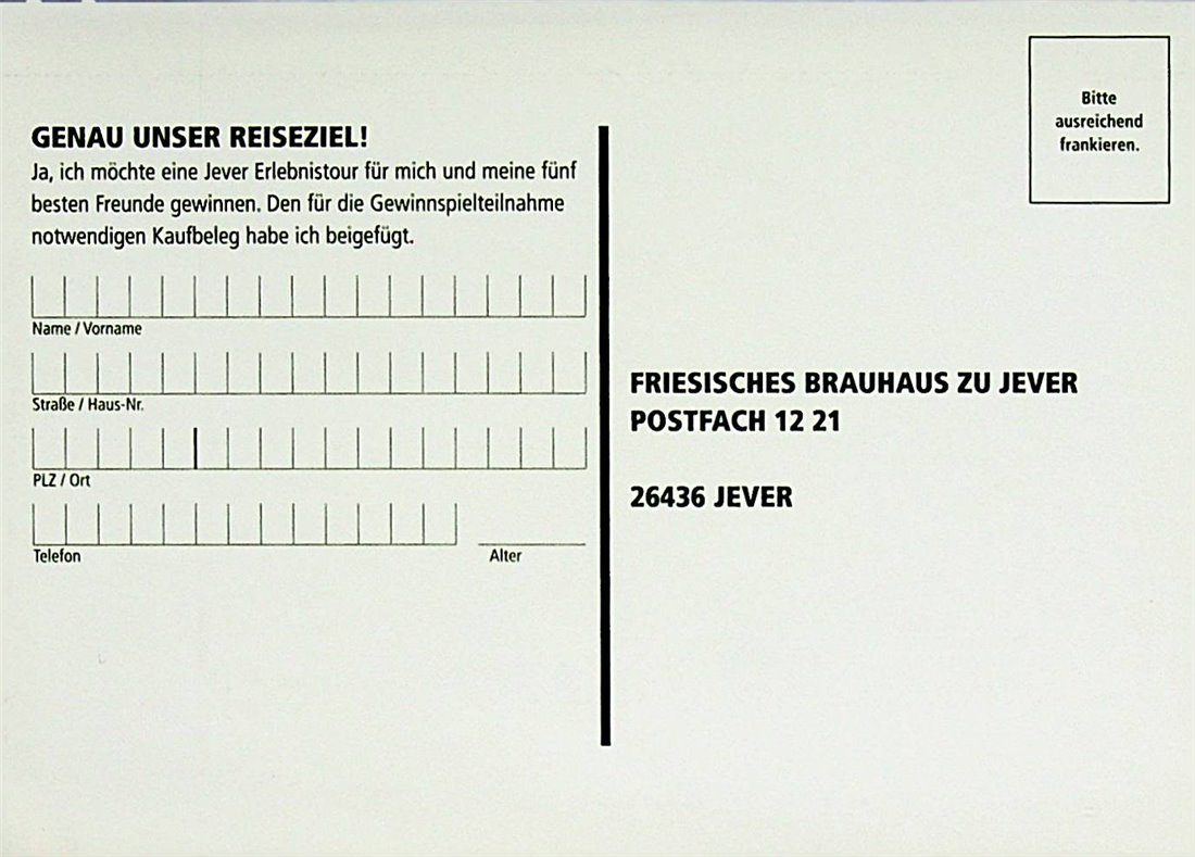 Genau unser Reiseziel! / Gewinne eine von 10 Jever Erlebnistouren für dich und deine fünf besten Freunde! / Friesisches Brauhaus zu Jever / JEVER / Friesisch-herb. / Hier bitte anfeuchten, falten und zukleben.