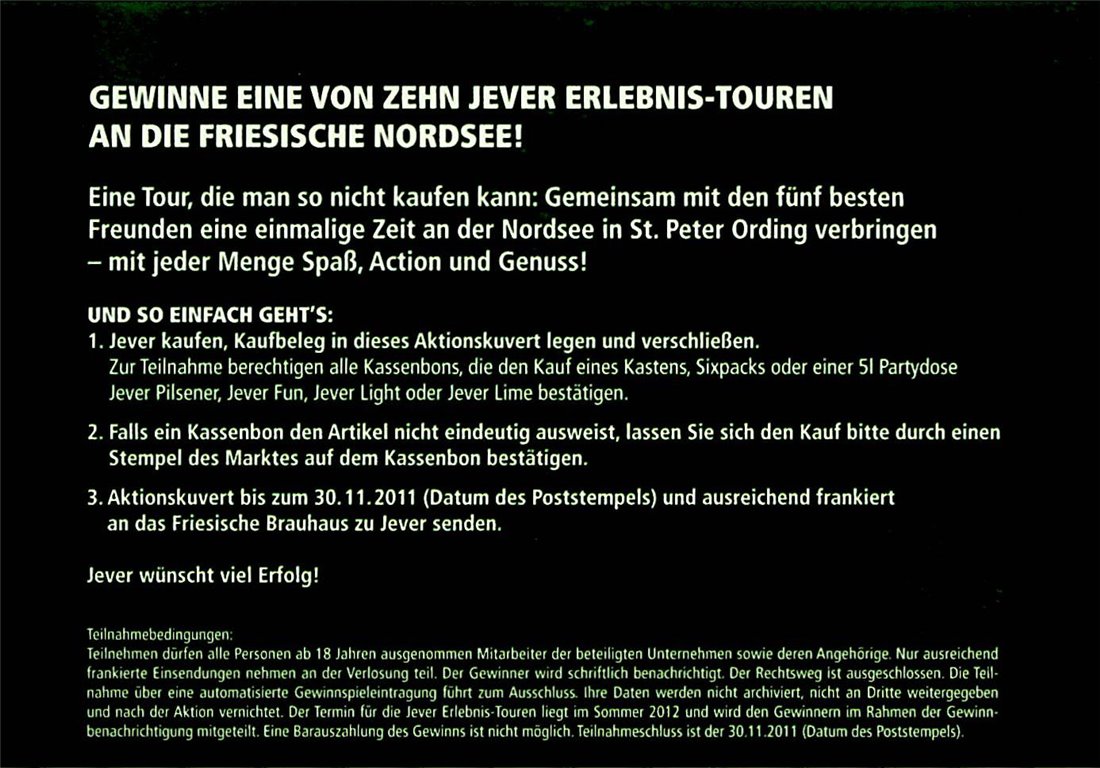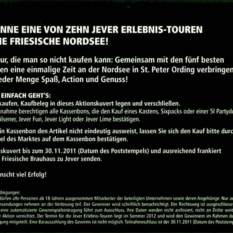 GEWINNE EINE VON ZEHN JEVER ERLEBNIS-TOUREN AN DIE FRIESISCHE NORDSEE! / Eine Tour, die man so nicht kaufen kann: Gemeinsam mit den fünf besten Freunden eien einmalige Zeit an der Nordsee in St. Peter Ording verbringen - mit jeder Menge Spaß, Action und Genuss! / UND SO EINFACH GEHT’S: / 1. Jever kaufen, Kaufbeleg in dieses Antwortkuvert legen und verschließen. Zur Teilnahme berechtigen alle Kassenbons, die den Kauf eines Kastens, Sixpacks oder einer 5l Partydose Jever Pilsener, Jever Fun, Jever Light oder Jever Lime bestätigen. / 2. Falls ein Kassenbon den Artikel nicht eindeutig ausweist, lassen Sie sich den Kauf bitte durch einen Stempel des Marktes auf dem Kassenbon bestätigen. / 3. Aktionskuvert bis zum 30.11.2011 (Datum des Poststempels) und ausreichend frankiert an das Friesische Brauahaus zu Jever senden. / Jever wünscht viel Erfolg! / Teilnahmebedingungen: Teilnehmen dürfen alle Personen ab 18 Jahren ausgenommen Mitarbeiter der beteiligten Unternehmen sowie deren Angehörige. Nur ausreichend frankierte Einsendungen nehmen an der Verlosung teil. Der Gewinner wird schriftlich benachrichtigt. Der Rechtsweg ist ausgeschlossen. Die Teilnahme über eine automatisierte Gewinnspieleintragung führt zum Ausschluss. Ihre Daten werden nicht archiviert, nicht an Dritte weitergegeben und nach der Aktion vernichtet. Der Termin für die Jever Erlebnis-Touren liegt im Sommer 2012 und wird den Gewinnern im Rahmen der Gewinnbenachrichtigung mitgeteilt. Eine Barauuszahlung des Gewinns ist nicht möglich. Teilnahmeschluss ist der 30.11.2011 (Datum des Poststempels).