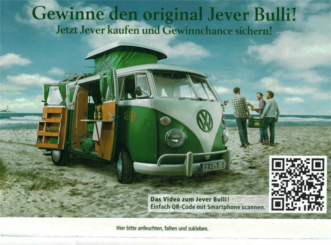 Gewinne den original Jever Bulli! / Jetzt Jever kaufen und Gewinnchance sichern! / Das Video zum Jever Bulli! Einfach QR-Code mit Smartphone scannen. / Hier bitte anfeuchten, falten und zukleben.