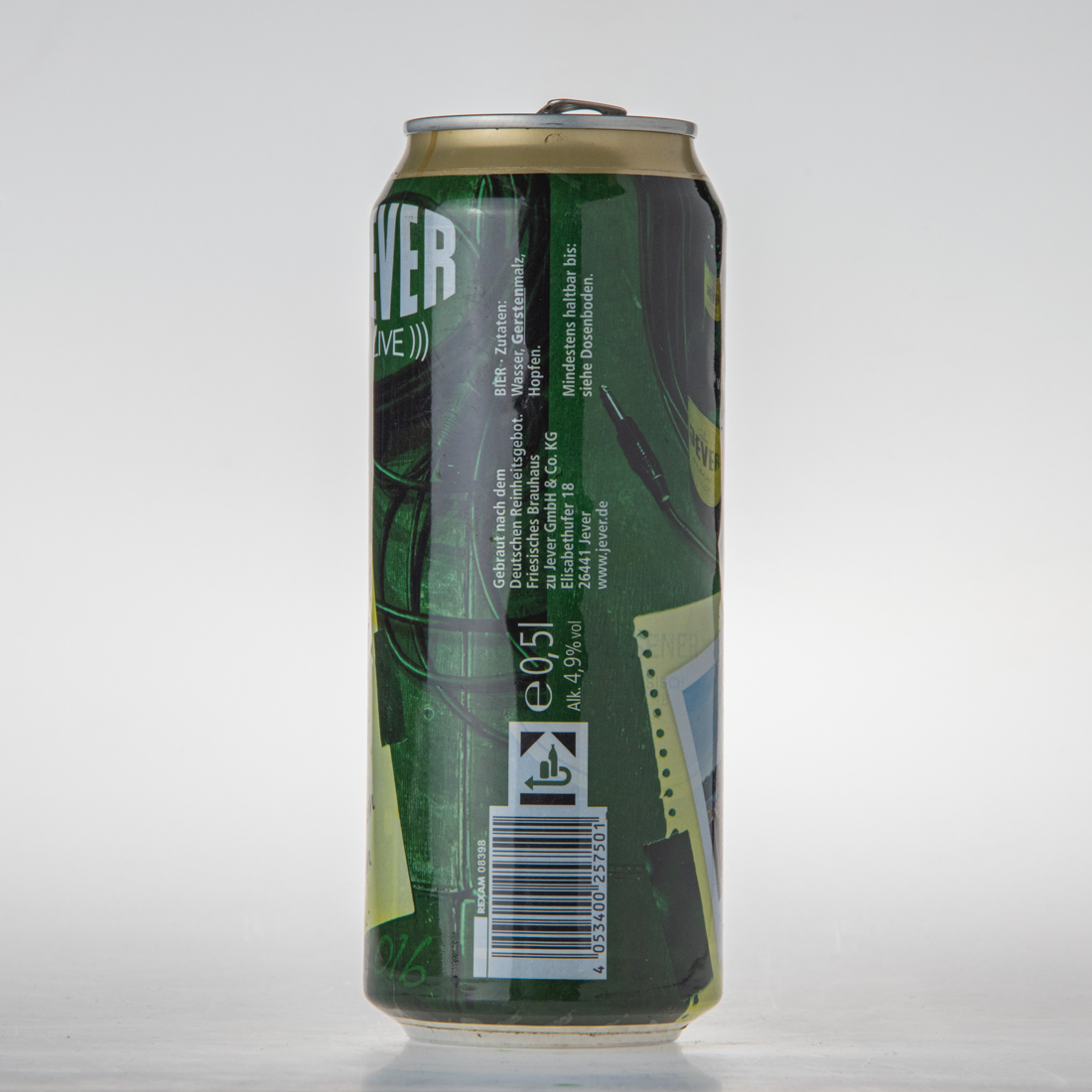 AL / DOSEN RECYCLING / Das weiche friesische Brunnenwasser und eine Spur mehr Hopfen verleihen Jever Pilsener den einzigartigen und unverwechselbar herben Charakter. / BIER BEWUSST GENIESSEN IHRE DEUTSCHEN BRAUER / 4 053400 257501 / e 0,5l Alk. 4,9% vol / Gebraut nach dem Deutschen Reinheitsgebot. Friesisches Brauhaus zu Jever GmbH & Co. KG Elisabethufer 18 26441 Jever www.jever.de / BIER - Zutaten: Wasser, Gerstenmalz, Hopfen / Mindestens haltbar bis: siehe Dosenboden