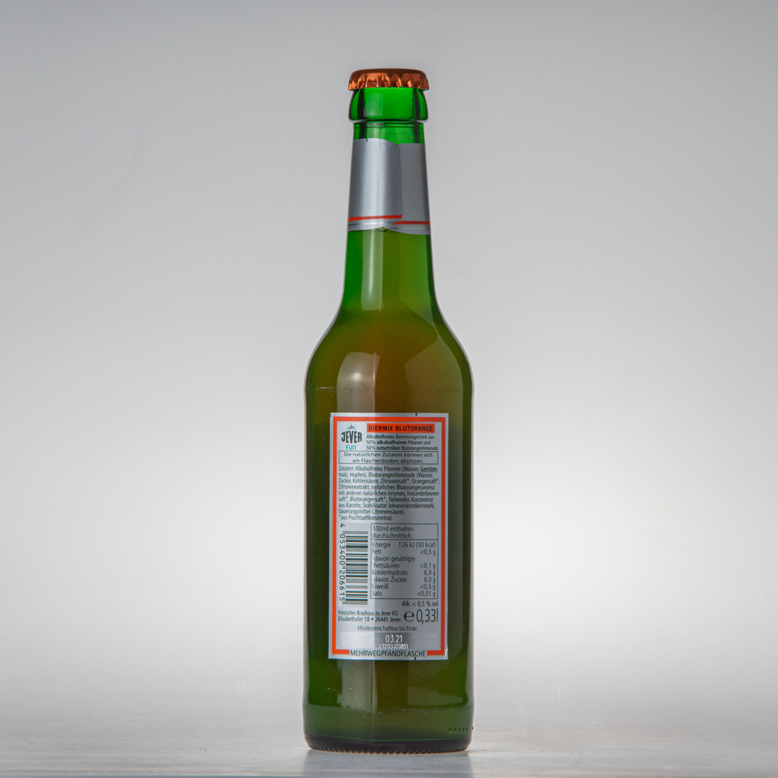Friesisches Brauhaus / JEVER / FUN / BIERMIX BLUTORANGE / Alkoholfreies Biermischgetränk aus 50% alkoholfreiem Pilsener und 50% naturtrüber Blutorangenlimonade. / Die natürlichen Zutaten können sich am Flaschenboden absetzen. / Zutaten: Alkoholfreies Pilsener (Wasser, Gerstenmalz, Hopfen, Gärungskohlensäure), Blutorangenlimonade (Wasser, Zucker, Kohlensäure, Zitronensaft, Orangensaft, Zitronenextrakt, natürliches Blutorangenaroma mit anderen natürlichen Aromen, Holunderbeerensaft, Blutorangensaft, färbendes Konzentrat aus Karotte, Stabilisator Johannisbrotkernmehl, Säuerungsmittel Citronensäure). * aus Fruchtsaftkonzentrat / 4 053400 206615 / 100ml enthalten durchschnittlich Energie 126kJ (30kcal) Fett <0,5g - davon gesättigte Fettsäuren <0,1g Kohlenhydrate 6,9g - davon Zucker 6,0g Eiweiß <0,5g Salz <0,01g / Alk. < 0,5% vol / Friesisches Brauhaus zu Jever KG Elisabethufer 18 26441 Jever / Mindestens haltbar bis Ende: 03.21 / MEHRWEGPFANDFLASCHE