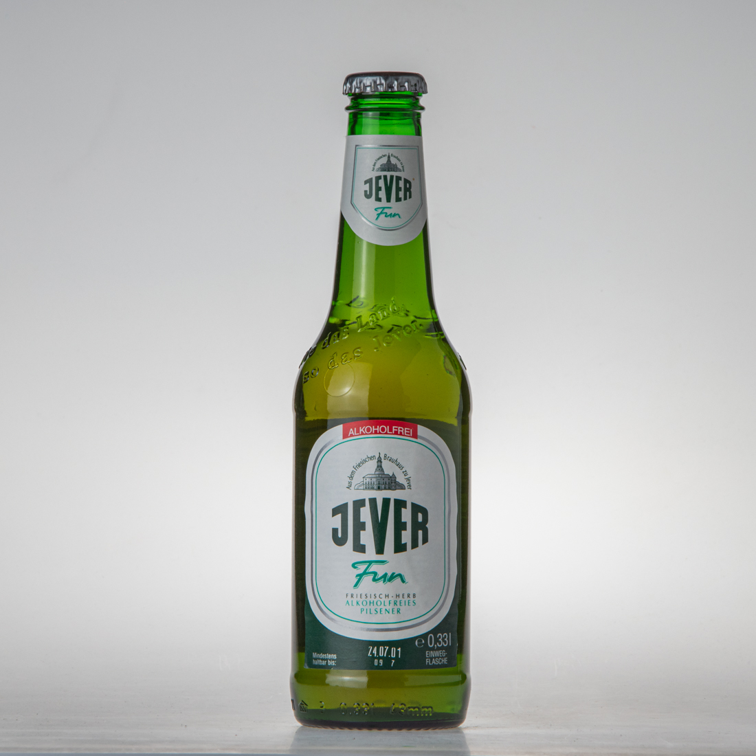 Aus dem Friesischen Brauhaus zu Jever / JEVER / Fun / ALKOHOLFREI / Aus dem Friesischen Brauhaus zu Jever / JEVER / Fun / FRIESISCH HERB / ALKOHOLFREIES PILSENER / Mindestens haltbar bis: 24.07.01 / e 0,33l EINWEG-FLASCHE