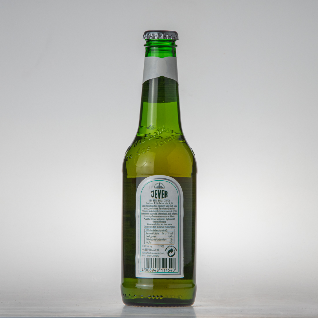 Aus dem Friesischen Brauhaus zu Jever / JEVER / BIER BEER BIRRA CERVEZA / … / Zutaten: Wasser, Gerstenmalz, Hopfenextrtakt, Gärungskohlensäure / Mindestens haltbar bis: siehe vorne. Gebraut nach dem Deutschen Reinheitsgebot. / 100ml enthalten/contain Brennwert/calories 76kJ (18kcal) Eiweiß/protein 0,47g Kohlenhydrate/carbohydrate 2,8g Fett/fat 0,0g / 11.6 fl. oz. imp. 1978-02 / e 0,33l/33cl/330ml / Friesisches Brauhaus zu Jever, 26441 Jever, Germany / DER GRÜNE PUNKT / 4 008948 114540