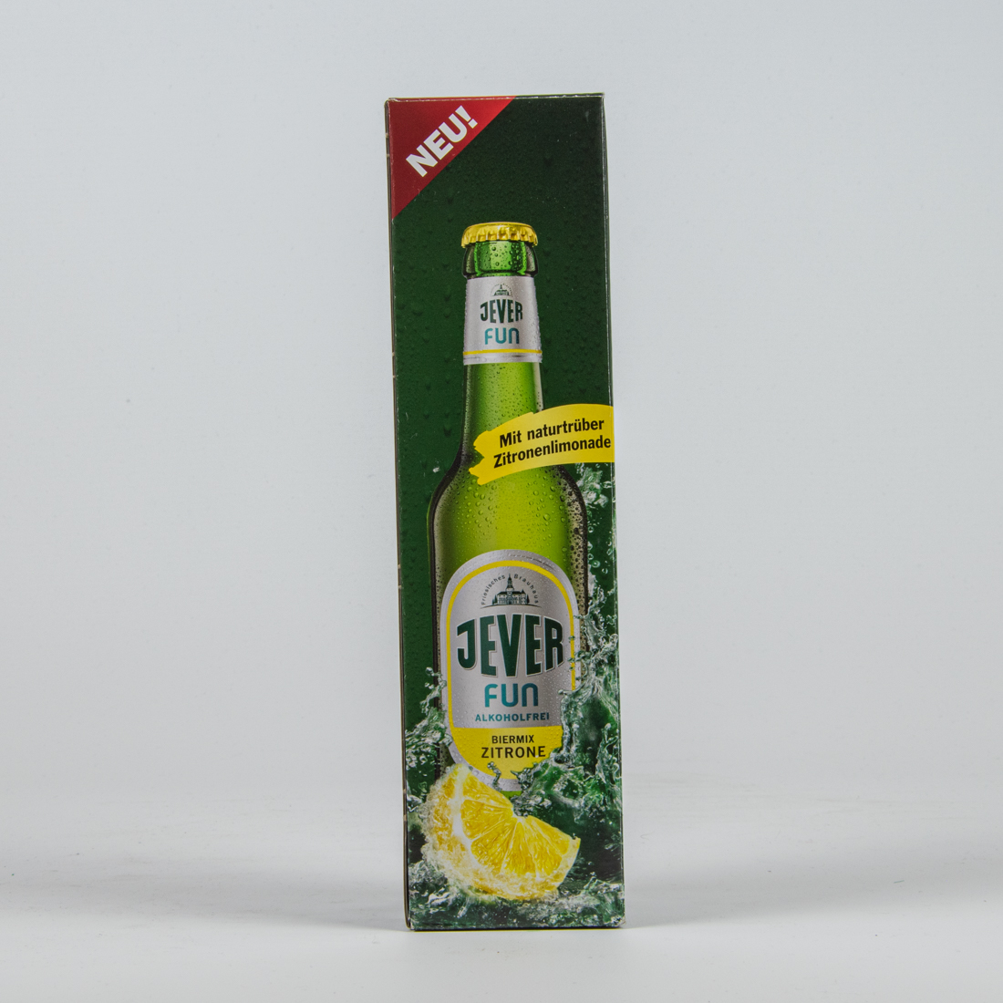 In diesen Kartons war jeweils eine Flasche Jever Fun Zitrone (siehe S0684) eingepackt. Der Karton mit der Flasche war eine sogenannte “Kastenbeilage”, welche beim Kauf eines Kasten Jever gratis dazugegeben wurde. Zeitpunkt der Ausgabe war vermutlich die Markteinführung von Jever Light, um den Kunden das neue Produkt vorzustellen.