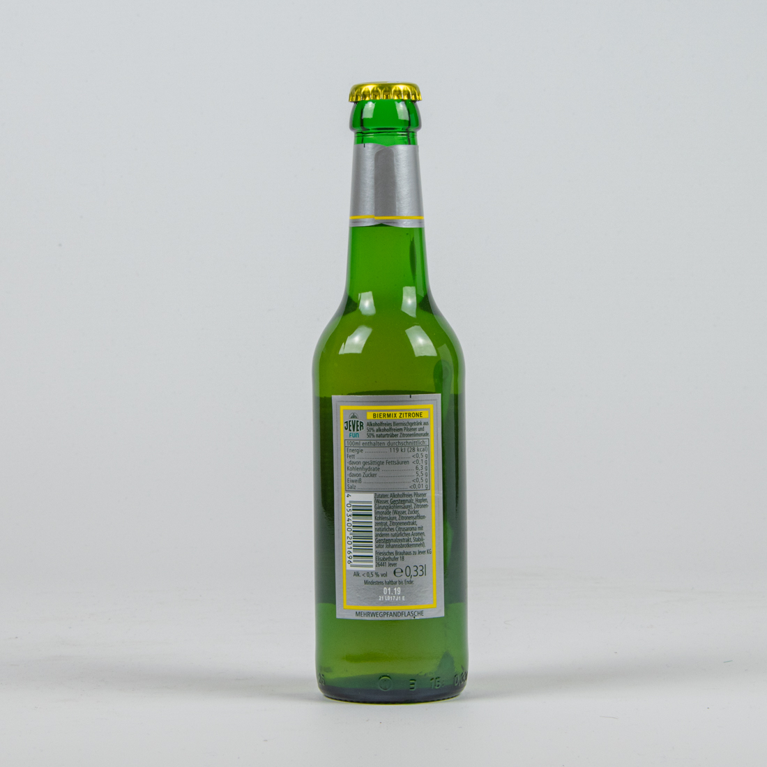 Friesisches Brauhaus / JEVER / FUN / BIERMIX ZITRONE / Alkoholfreies Biermischgetränk aus 50% alkoholfreiem Pilsener und 50% naturtrüber Zitronenlimonade. / 100ml enthalten durchschnittlich Energie 119kJ (29kcal) Fett <0,5g - davon gesättigte Fettsäuren <0,1g Kohlenhydrate 6,3g - davon Zucker 5,5g Eiweiß <0,5g Salz <0,01g / 4 053400 201696 / Zutaten: Alkoholfreies Pilsener (Wasser, Gerstenmalz, Hopfen, Gärungskohlensäure), Zitronenlimonade (Wasser, Zucker, Kohlensäure, Zitronensaftkonzentrat, Zitronenextrakt, natürliches Citrusaroma mit anderen natürlichen Aromen, Gerstenmalzextrakt, Stabilisator Johannisbrotkernmehr). / Friesisches Brauhaus zu Jever KG Elisabethufer 18 26441 Jever / Alk. <0,5% vol / e 0,33l / Mindestens haltbar bis Ende: 01.19 / MEHRWEGPFANDFLASCHE
