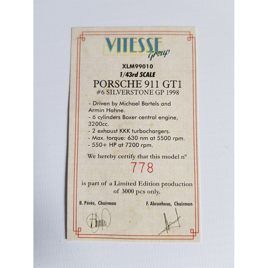 VITESSE Group / XLM99010 / 1/43rd SCALE / #6 SILVERSTONE GP 1998 / - Driven by Michael Bartels and Armin Hahne. / - 6 cylinders Boxer central engine, 3200cc. / - 2 exhaust KKK turbochargers. / Max. torque: 630 nm at 5500 rpm. / - 550+ HP at 7200 rpm. / We hereby certify that this model no 778 is part of a Limited Edition production of 3000 pcs only. / B. Peres, Chairman / F. Abrunhosa, Chairman