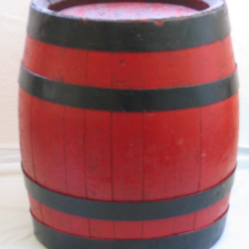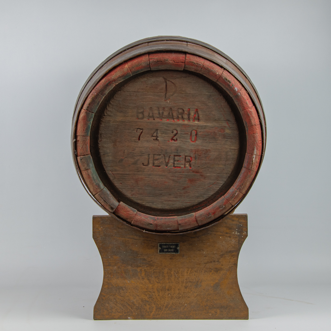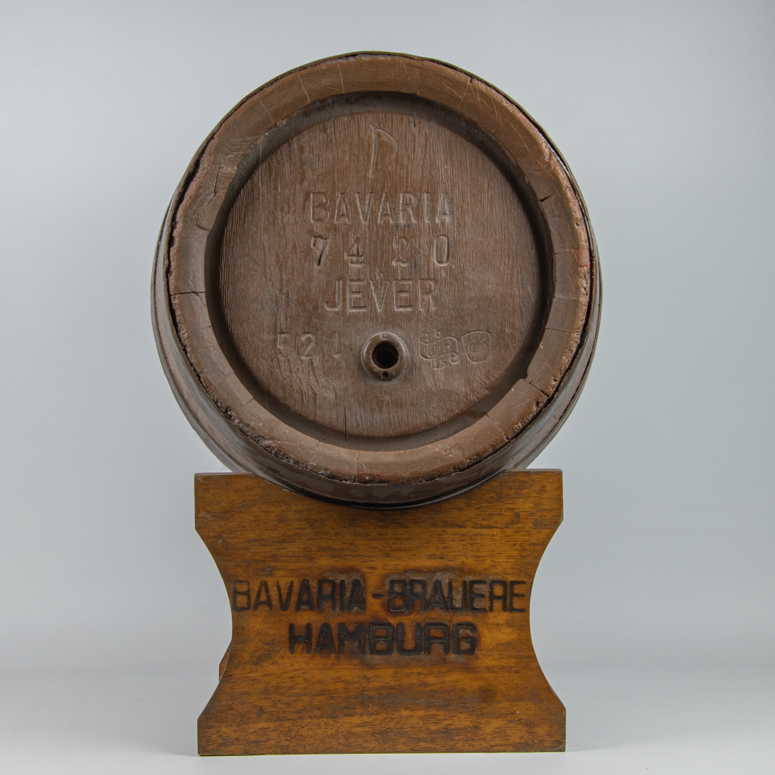 Die etwas ungeraden Inhalte der Holzfässer kamen dadurch zustande, dass die Fässer nach der Herstellung durch den Böttcher von innen mit Pech beschichtet wurden, damit sie dicht sind. Dies war nicht so genau zu steuern, sodass der Inhalt eines jeden Fasses einzeln festgestellt und am Fass notiert werden musste. Auf der Unterseite ist noch die typische rote Bavaria-Farbe zu sehen. Das Fass wurde später in einen “gängigen” Farbton (braun) umgestrichen. Der auf dem Bild zu sehende Bock ist genaugenommen nicht von Jever, aber in der Alterskategorie darf man nicht zu wählerisch sein. Immerhin ist er aus dem gleichen Unternehmen, nur eben aus Hamburg.