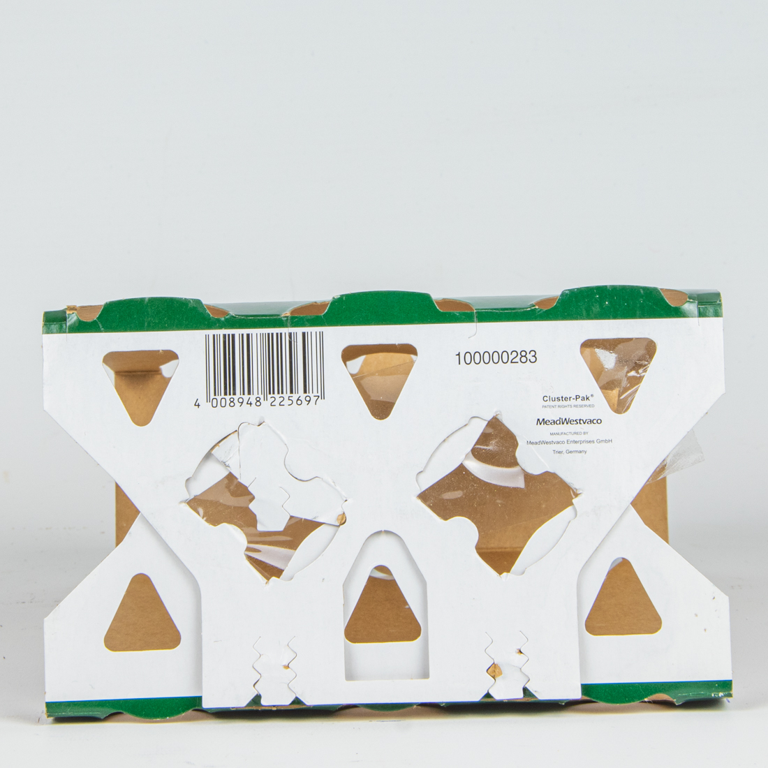 4 008948 225697 / 100000283 / Cluster-Pak / PATENT RIGHTS RESERVED / MeadWestvaco / MANUFACTURED BY / MeadWestvaco Enterprises GmbH / Trier, Germany
