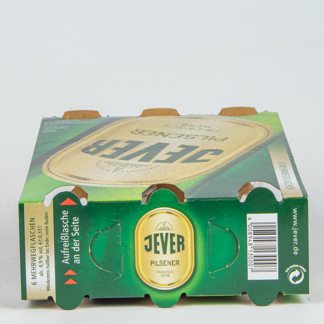 6 MEHRWEGPFANDFLASCHEN alc. 4,9% vol, e 0,33l / Mindestens haltbar bis Ende: siehe Boden. / Aufreißlasche an der Seite / Friesisches Brauhaus / JEVER / PILSENER / FRIESISCH HERB / 4 008948 130007 / www.jever.de / DER GRÜNE PUNKT