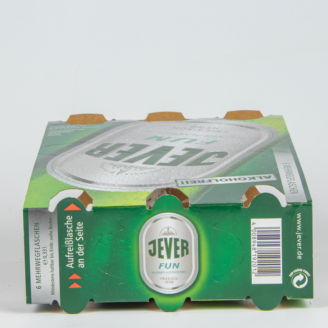 6 MEHRWEGFLASCHEN e 0,33l / Mindestens haltbar bis Ende: siehe Boden. / Aufreißlasche an der Seite / Friesisches Brauhaus / JEVER / FUN / PILSENER ALKOHOLFREI / FRIESISCH HERB / 4 008948 192012 / www.jever.de / DER GRÜNE PUNKT