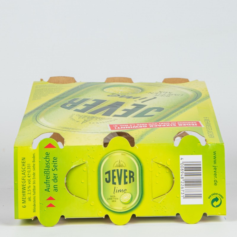 6 MEHRWEGFLASCHEN alc. 2,5% vol, e 0,33l / Mindestens haltbar bis Ende: siehe Boden. / Aufreißlasche an der Seite / Friesisches Brauhaus / JEVER / lime / BIER-LIMETTEN-MIX / 4 008948 226731 / www.jever.de / DER GRÜNE PUNKT