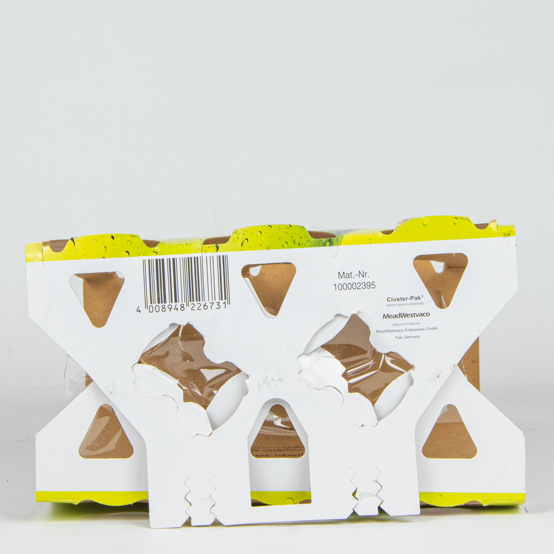4 008948 226731 / Mat.-Nr. 100002395 / Cluster-Pak / PATENT RIGHTS RESERVED / MeadWestvaco / MANUFACTURED BY / MeadWestvaco Enterprises GmbH / Trier, Germany / 0509