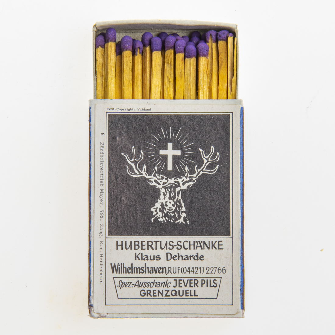 Attribut Wert Alter (min.) Alter (max.) Identifikation (Jever-Fan) ID I003849 / S1361 / B53 Typ Streichhölzer Attribute (Allgemein) Form Quader Gastronomie Hubertus-Schänke Herstellername Werbezündholz-Vertrieb Mayer Maße HxBxT (cm) 5,1x3,6x1,2 Material Papier/Pappe Ort Wilhelmshaven > Wilhelmshaven > Wilhelmshaven > Niedersachsen > Deutschland Sorte Pilsener
