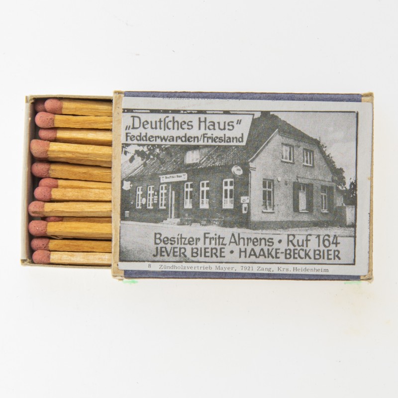 Attribut Wert Alter (min.) Alter (max.) Identifikation (Jever-Fan) ID I003861 / S1373 / B53 Typ Streichhölzer Attribute (Allgemein) Form Quader Gastronomie Deutsches Haus Herstellername Werbezündholz-Vertrieb Mayer Maße HxBxT (cm) 3,6x5,1x1,2 Material Papier/Pappe Ort Fedderwarden > Wilhelmshaven > Landkreis Friesland > Niedersachsen > Deutschland Sorte (Dachmarke)