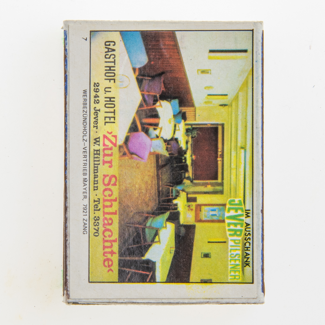 Attribut Wert Alter (min.) Alter (max.) Identifikation (Jever-Fan) ID I003864 / S1376 / B53 Typ Streichhölzer Attribute (Allgemein) Form Quader Gastronomie Zur Schlachte Herstellername Werbezündholz-Vertrieb Mayer Logo Pilsener 17 Maße HxBxT (cm) 3,6x5,1x1,2 Material Papier/Pappe Ort Jever > Jever > Landkreis Friesland > Niedersachsen > Deutschland Sorte Pilsener