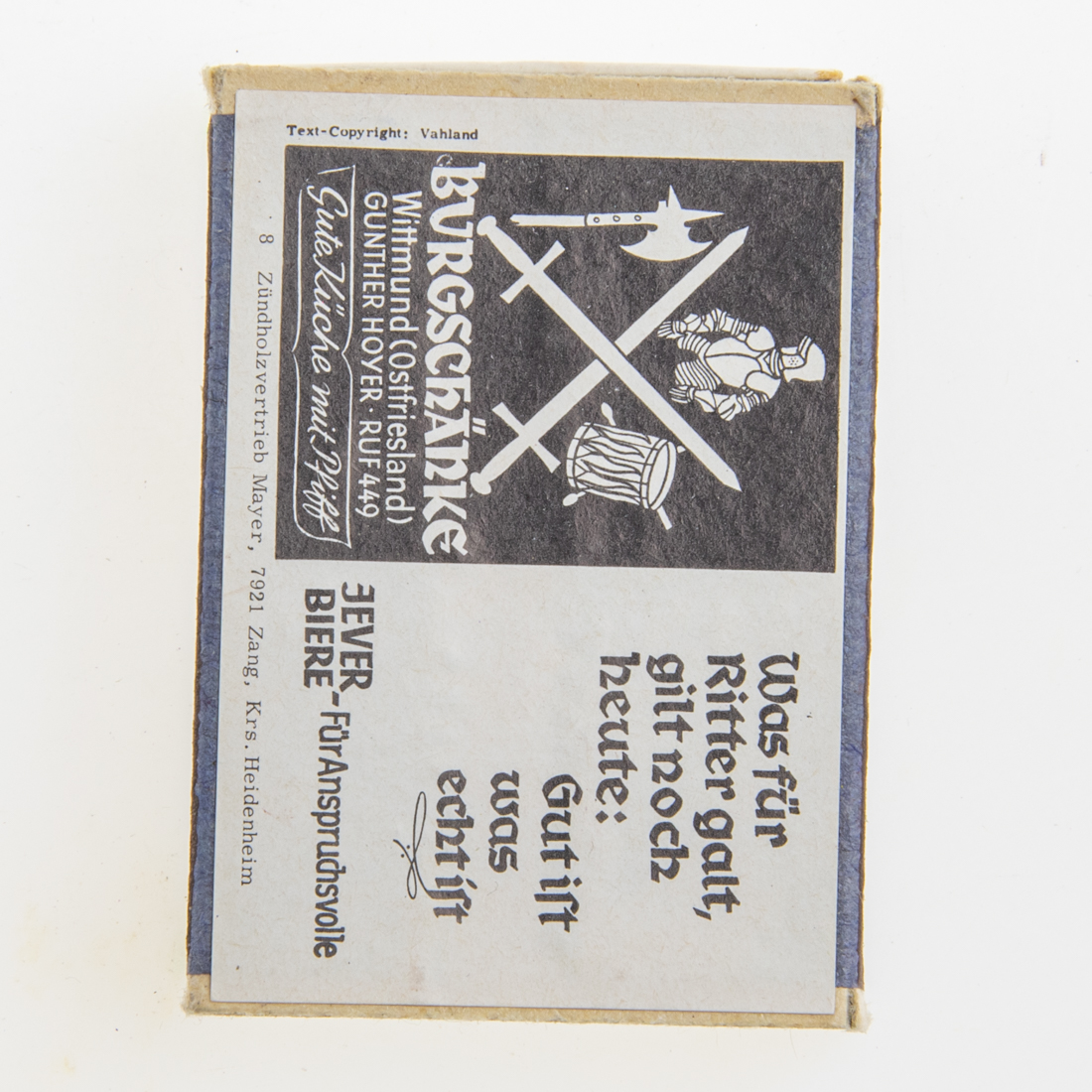 Attribut Wert Alter (min.) Alter (max.) Identifikation (Jever-Fan) ID I003868 / S1381 / B53 Typ Streichhölzer Attribute (Allgemein) Form Quader Gastronomie Burgschänke Herstellername Werbezündholz-Vertrieb Mayer Maße HxBxT (cm) 3,6x5,1x1,2 Material Papier/Pappe Ort Wittmund > Wittmund > Landkreis Wittmund > Niedersachsen > Deutschland Slogan Für Anspruchsvolle Sorte (Dachmarke)