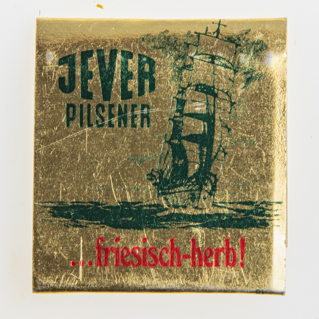 Attribut Wert Alter (min.) Alter (max.) Identifikation (Jever-Fan) ID I003897 / S1410 / B53 Typ Streichhölzer Attribute (Allgemein) Form Quader Logo Pilsener 2 Logo Pilsener 22 Maße HxBxT (cm) 5,5x5,0x0,3 Material Papier/Pappe Motiv Rundliche Schrift Slogan Ein Bier wie man es besser nicht brauen kann in Deutschland Slogan Friesisch herb Slogan Friesische Braukunst Slogan Goldblank Hopfenherb Sorte Pilsener