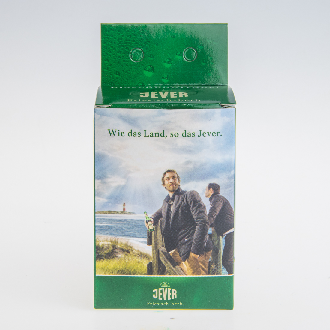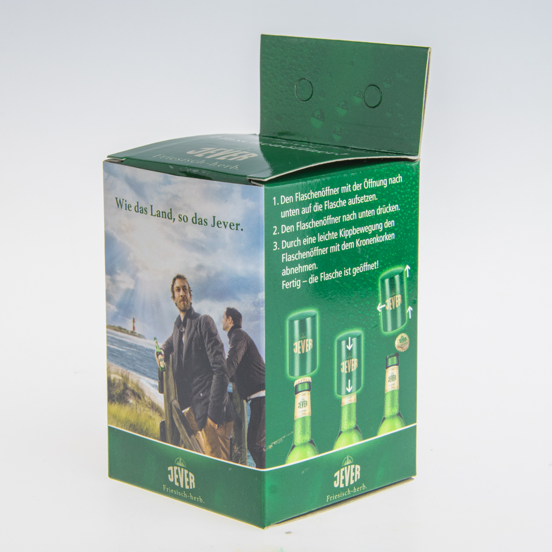 Wie das Land, so das Jever. / Friesisches Brauhaus / JEVER / Friesisch-herb. / Der exklusive Jever Flaschenöffner! / www.jever.de / 1. Den Flaschenöffner mit der Öffnung nach unten auf die Flasche aufsetzen. / 2. Den Flaschenöffner nach unten drücken. / 3. Durch eine leichte Kippbewegung den den Flaschenöffner mit dem Kronenkorken abnehmen. Fertig - die Flasche ist geöffnet!