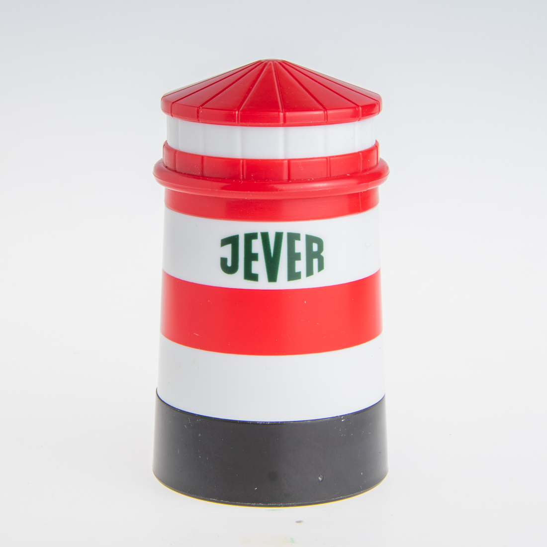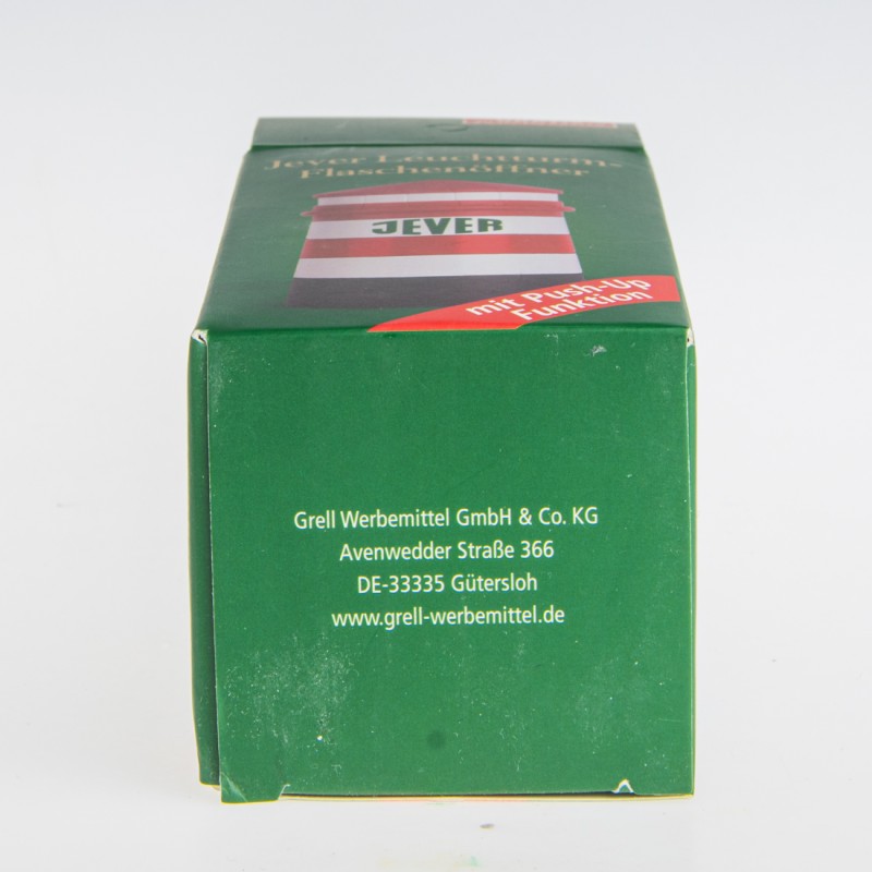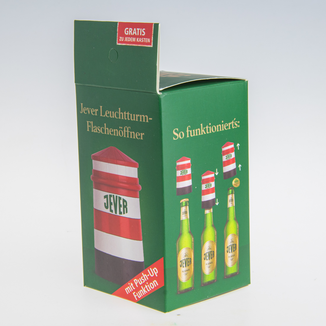 GRATIS ZU JEDEM KASTEN / Jever Leuchtturm-Flaschenöffner / mit Push-Up Funktion / So funktioniert’s: / Friesisch-herb. / Grell Werbemittel GmbH & Co. KG / Avenwedder Straße 366 / DE-33335 Gütersloh / www.grell-werbemittel.de