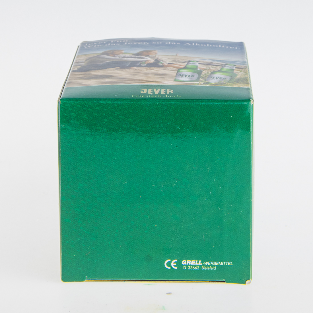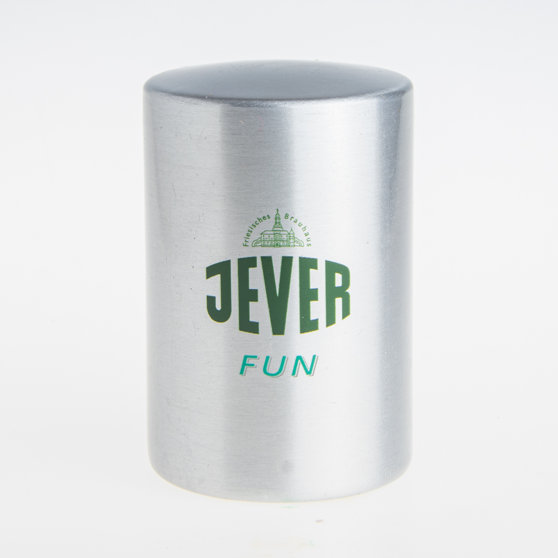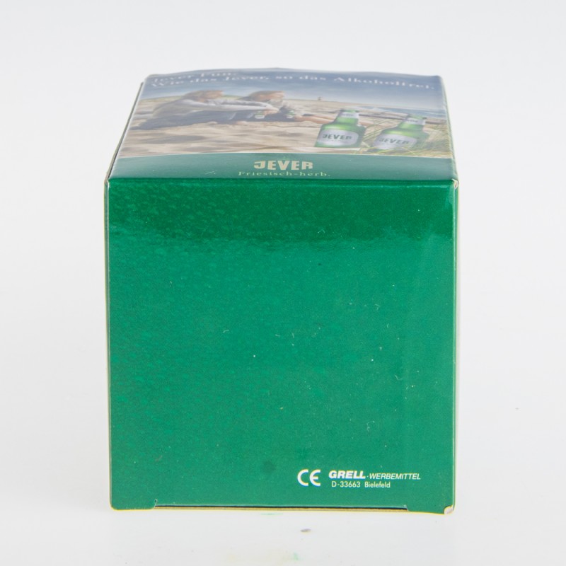 Jever Fun. / Wie das Jever, so das Alkoholfrei. / Friesisches Brauhaus / JEVER / Friesisch-herb. / 1. Den Flaschenöffner mit der Öffnung nach unten auf die Flasche aufsetzen. / 2. Den Flaschenöffner nach unten drücken. / 3. Durch eine leichte Kippbewegung den den Flaschenöffner mit dem Kronenkorken abnehmen. Fertig - die Flasche ist geöffnet! / CE / GRELL WERBEMITTEL / D-33663 Bielefeld