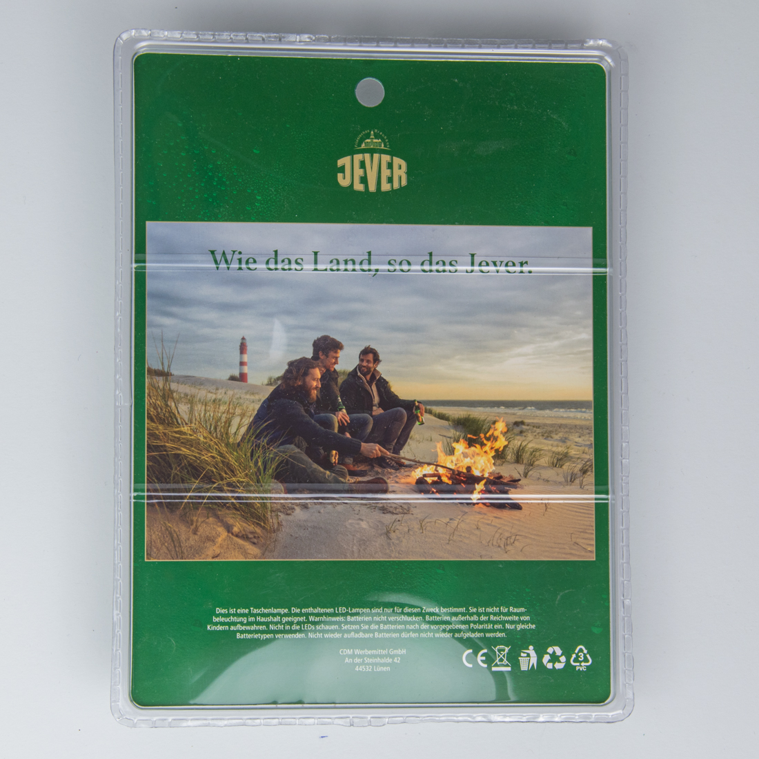 DIE JEVER TASCHENLAMPE / Friesisches Brauhaus / JEVER / Wie das Land, so das Jever. / Dies ist eine Taschenlampe. Die enthaltenen LED-Lampen sind nur für diesen Zweck bestimmt. Sie ist nicht für Raumeleuchtung im Haushalt geeignet. Warnhinweis: Batterien nicht verschlucken. Batterien außerhalb der Reichweite von Kindern aufbewahren. Nicht in die LEDs schauen. Setzen Sie die Batterien nach der vorgegebenen Polarität ein. Nur gleiche Batterietypen verwenden. Nicht wieder aufladbare Batterien dürfen nicht wieder aufgeladen werden. / CDM Werbemittel GmbH / An der Steinhalde 42 / 44532 Lünen