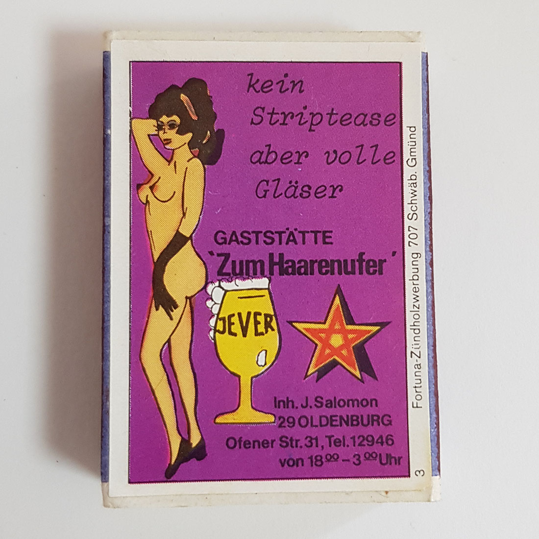 Attribut Wert Alter (min.) Alter (max.) Identifikation (Jever-Fan) ID I004222 / S1760 / B53 Typ Streichhölzer Attribute (Allgemein) Form Quader Gastronomie Zum Haarenufer Logo Dachmarke 1 Maße HxBxT (cm) 5,3x3,6x1,3 Material Papier/Pappe Ort Oldenburg (Oldb) > Oldenburg (Oldb) > Oldenburg (Oldb) > Niedersachsen > Deutschland Sorte (Dachmarke)