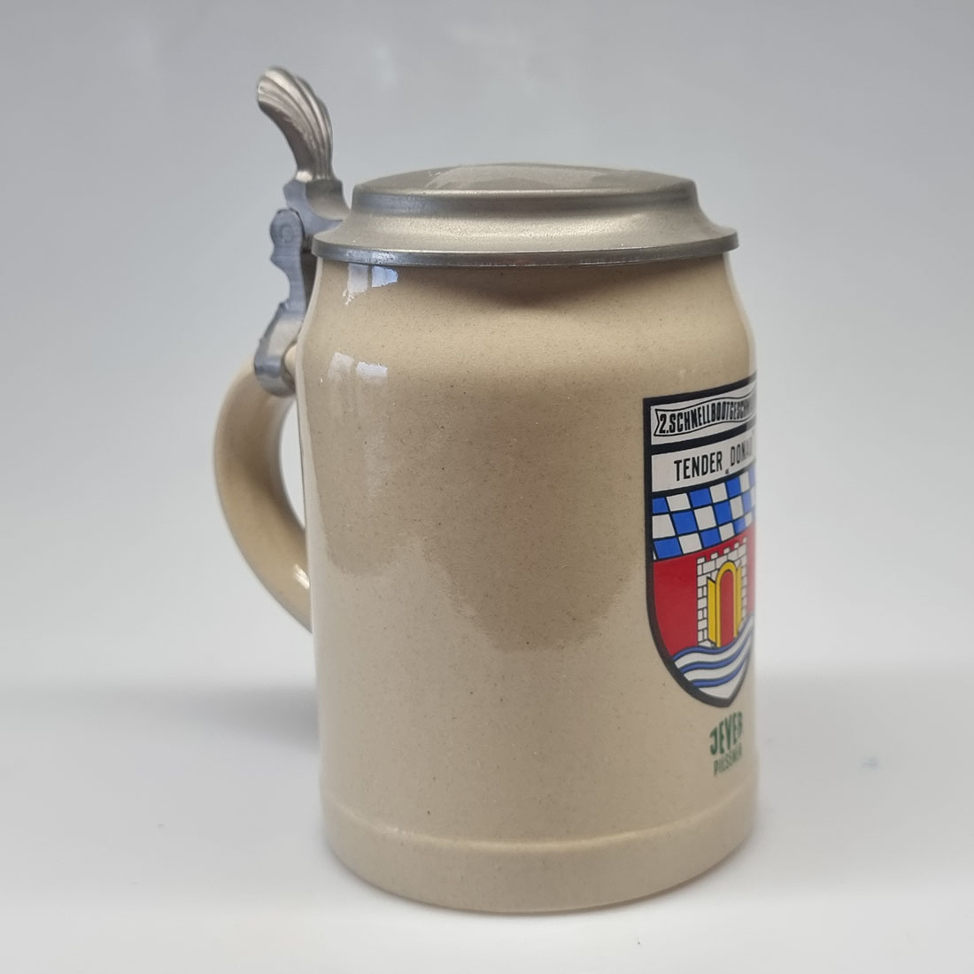 Attribut Wert Alter (min.) Alter (max.) Identifikation (Jever-Fan) ID I004316 / K0375 / Typ Krug Attribute (Allgemein) Form Krug / Seidel Füllstrich geprägt > 0,5l////W Hersteller-Zeichen W Inhalt (l) 0,50 Logo Pilsener 2 Maße HxBxT (cm) 16,3x9,5x9,5 Material Steingut Material Zinn Sorte Pilsener