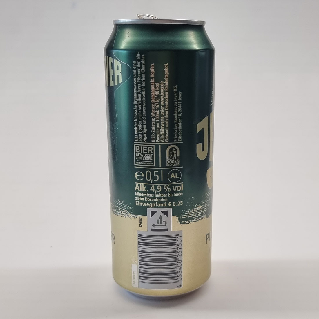 Das weiche friesische Brunnenwasser und eine Spur Hopfen mehr verleihen Jever Pilsener den einzigartigen und unverwechselbar herben Charakter. / BIER Zutaten: Wasser, Gerstenmalz, Hopfen. / Energie pro 100ml: 167 kJ / 40 kcal / Alle Nährwerte unter www.jever.de / Gebraut nach dem Deutschen Reinheitsgebot. / Friesisches Brauhaus zu Jever KG, Elisabethufer 18, 26441 Jever / BIER BEWUSST GENIESSEN. DIE DEUTSCHEN BRAUER. / DOSEN RECYCLING / e 0,5l AL / Alk. 4,9 % vol / Mindestens haltbar bis Ende: siehe Dosenboden. / Einwegpfand € 0,25 / 12680 / 4 053400 257501