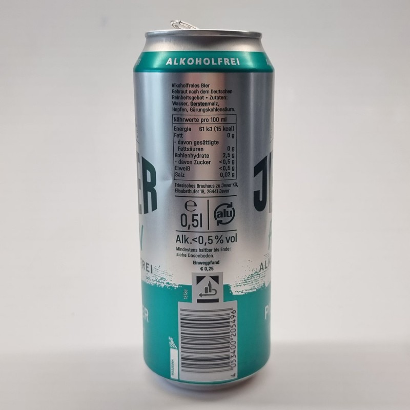 ALKOHOLFREI / Alkoholfreies Bier / Gebraut nach dem Deutschen Reinheitsgebot / Zutaten: Wasser, Gerstenmalz, Hopfen, Gährungskohlensäure. / Nährwerte pro 100 ml Energie 61 kJ (15 kcal) Fett 0 g - davon gesättigte Fettsäuren 0 g Kohlenhydrate 2,5 g - davon Zucker <0,5 g Eiweiß < 0,5 g Salz 0,02 g / Friesisches Brauhaus zu Jever KG, Elisabethufer 18, 26441 Jever / e 0,5l / alu / Alk. <0,5 % vol / Mindestens haltbar bis Ende: siehe Dosenboden. / Einwegpfand € 0,25 / 15756 / 4 053400 205496