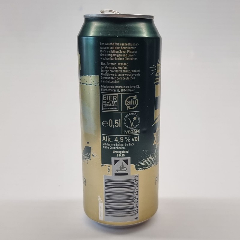 Das weiche friesische Brunnenwasser und eine Spur Hopfen mehr verleihen Jever Pilsener den einzigartigen und unverwechselbar herben Charakter. / Bier. Zutaten: Wasser, Gerstenmalz, Hopfen. / Energie pro 100ml: 167 kJ / 40 kcal / Alle Nährwerte unter www.jever.de / Gebraut nach dem Deutschen Reinheitsgebot. / Friesisches Brauhaus zu Jever KG, Elisabethufer 18, 26441 Jever / BIER BEWUSST GENIESSEN. DIE DEUTSCHEN BRAUER. / alu / e 0,5l / V-LABEL-INTERNATIONAL V-LABEL.COM / Alk. 4,9 % vol / Mindestens haltbar bis Ende: siehe Dosenboden. / Einwegpfand € 0,25 / 14846 / 4 053400 257501