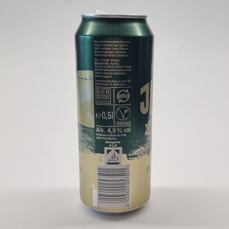 Das weiche friesische Brunnenwasser und eine Spur Hopfen mehr verleihen Jever Pilsener den einzigartigen und unverwechselbar herben Charakter. / Bier. Zutaten: Wasser, Gerstenmalz, Hopfen. / Energie pro 100ml: 167 kJ / 40 kcal / Alle Nährwerte unter www.jever.de / Gebraut nach dem Deutschen Reinheitsgebot. / Friesisches Brauhaus zu Jever KG, Elisabethufer 18, 26441 Jever / BIER BEWUSST GENIESSEN. DIE DEUTSCHEN BRAUER. / alu / e 0,5l / V-LABEL-INTERNATIONAL V-LABEL.COM / Alk. 4,9 % vol / Mindestens haltbar bis Ende: siehe Dosenboden. / Einwegpfand € 0,25 / 15712 / 4 053400 257501