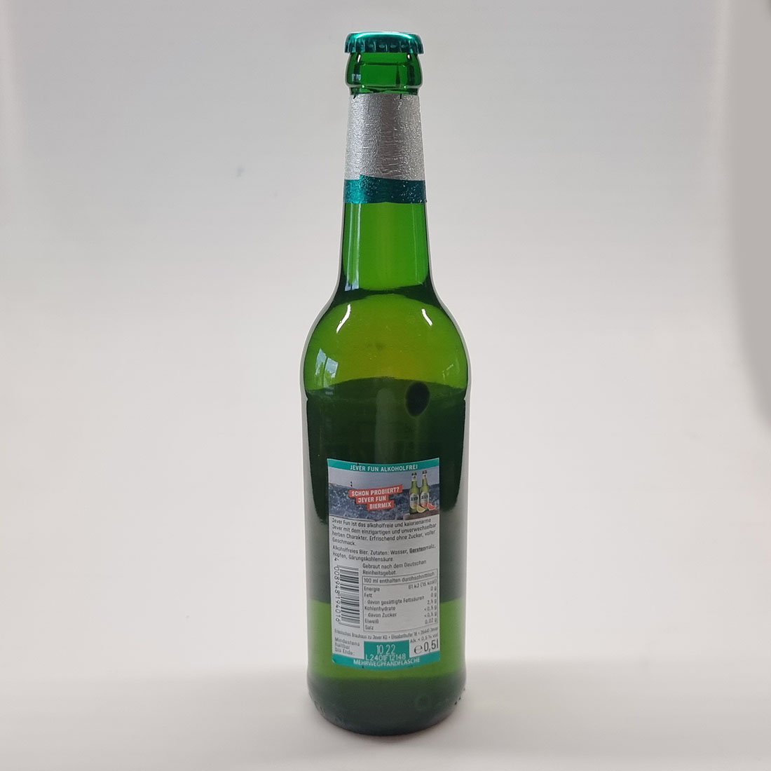 JEVER FUN ALKOHOLFREI / SCHON PROBIERT? JEVER FUN BIERMIX / Jever Fun ist das alkoholfreie und kalorienarme Jever mit dem einzigartigen und unverwechselbar herben Charakter. Erfrischend ohne Zucker, voller Geschmack. / Alkoholfreies Bier. Zutaten: Wasser, Gerstenmalz, Hopfen, Gärungskohlensäure. / Gebraut nach dem Deutschen Reinheitsgebot. / 4 008948 194016 / 100 ml enthalten durchschnittlich: / Energie 61 kJ (15kcal) / Fett 0 g / - davon gesättigte Fettsäuren 0 g / Kohlenhydrate 2,5 g / - davon Zucker < 0,5 g / Eiweiß < 0,5 g / Salz 0,02 g / Friesisches Brauhaus zu Jever KG Elisabethufer 18 26441 Jever / Mindestens haltbar bis Ende 10.22 L2401F12148 / Alk. < 0,5 % vol / e 0,5l / MEHRWEGPFANDFLASCHE